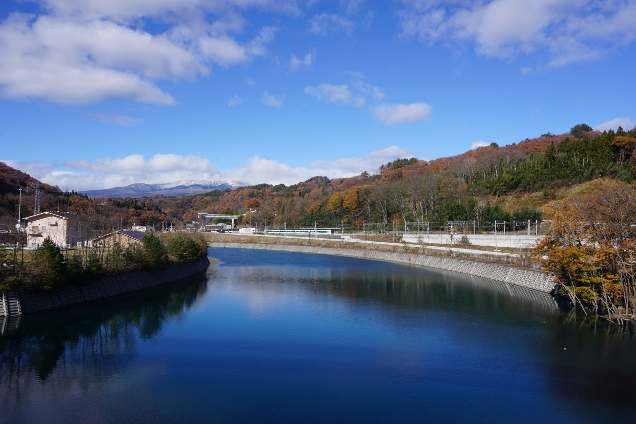 振り返ると、長野原草津口駅とその背後には雪を積もらせた草津白根山が見えていた。山々の紅葉も見ごろでとてもきれいだった。ダム湖に水が入る前の写真はネットで探せば見つかる。このあたりも川は峡谷となっていて、谷は結構深い。ダム湖があるので、高さを感じないが、実際元々の水面からは結構な高さがある。