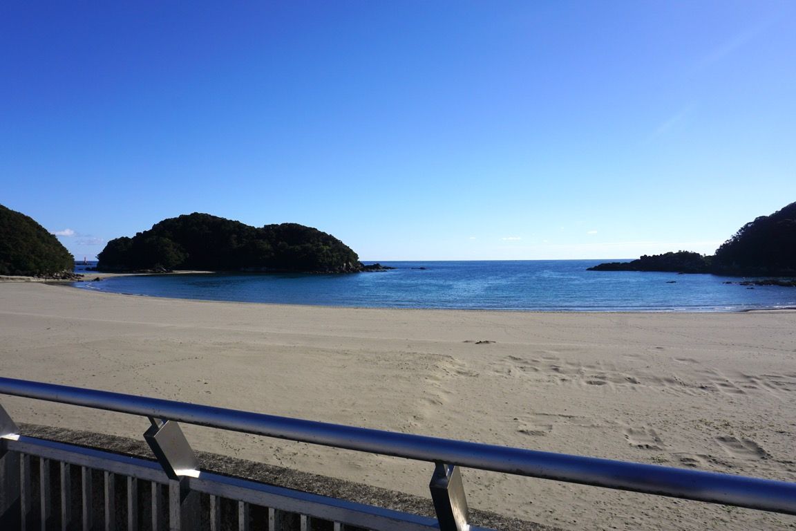 食堂でお腹を満たした後は、道の駅周辺をしばらく散策。ここには白浜海水浴場が広がっている。名前の通り、白い砂浜が特徴的な海岸。アーチ状の海岸線がとても美しい場所だった。この時間は干潮の時間だったのか、かなり水が引いていた。海岸まで歩いて行ってみようかと思ったが、砂浜を歩いたら靴が大変なことになるので、遠目から眺めるだけにしておいた。
