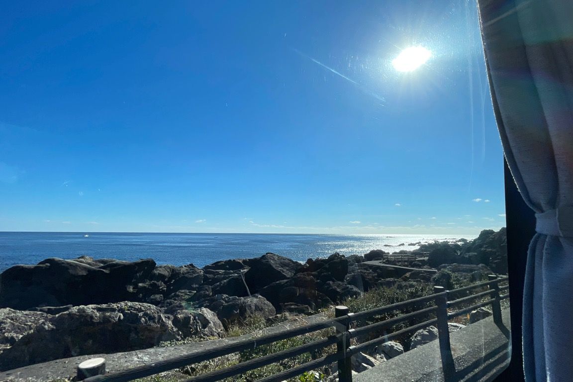 バスは来た道を戻る形で、ついさっきまで滞在していた室戸岬を通過。約40分ぶりに岬の景色を再び眺める。道路は左側通行なので、当然ながら室戸から安芸へ向かう方が海が近く見える。バスは窓一杯に広がる室戸岬の景色を眺めながら進んでいく。このように本当は徳島→高知と旅した方が、海をより目前に楽しめるのだが、このルートだと晴れた日は、基本的に一日中眩しい。それが難点である。