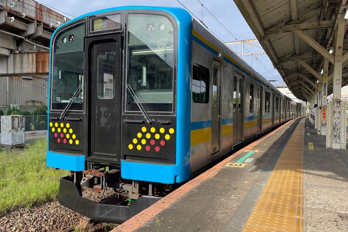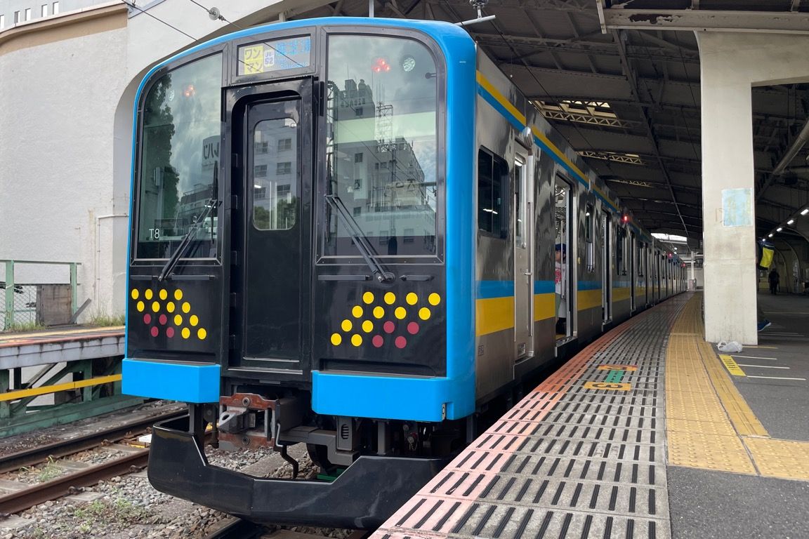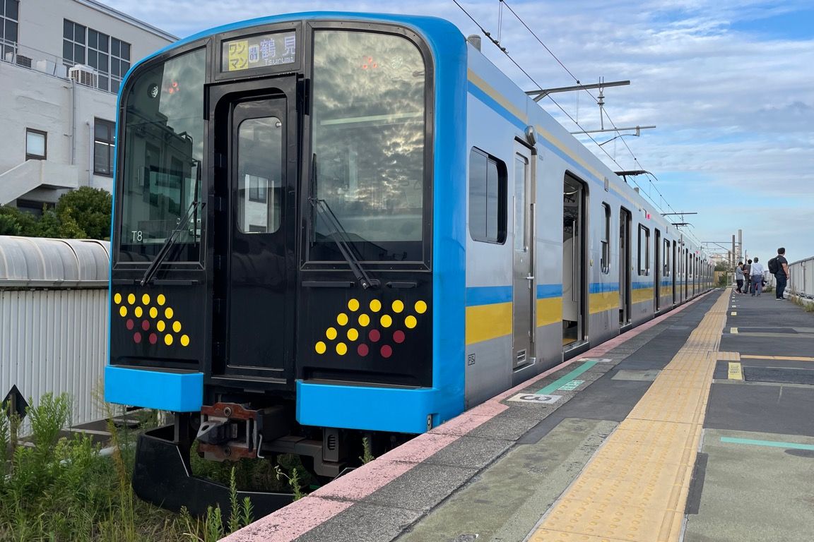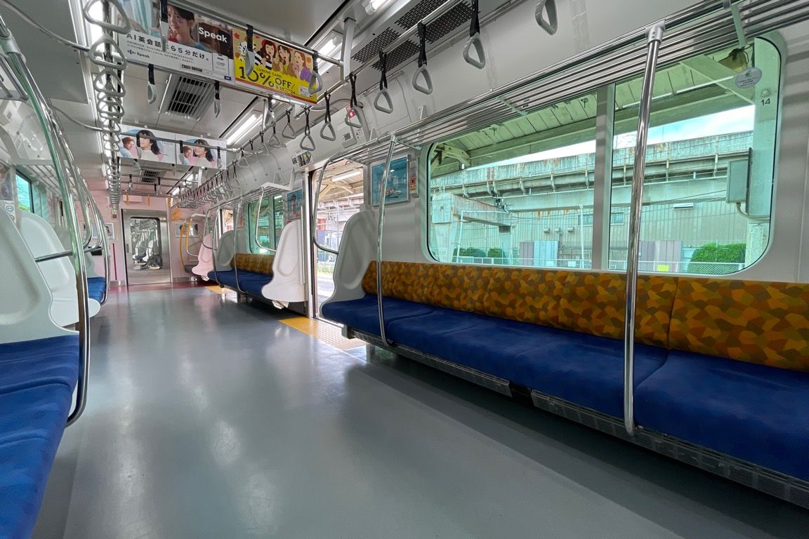 先ほど乗車した南武線浜川崎支線と同様に、鶴見線でも以前は205系が活躍していた。しかし、2023年に新型車両E131系1000番台が投入され、現在は全列車がこの車両で運転されている。鶴見線用の1000番台は3両編成でオールロングシート。他の形式とは規格が異なっており、他番台が拡幅車体な一方で、こちらは直方体のようなストレート車体となっている。車体幅が短い分、中央の貫通扉部分も短くなっているのだが、実はこの貫通扉、車内には扉の部分にも機器が置かれていて、実は見た目上貫通扉になっているだけで、実は非貫通となっている。ストレート車体であるというのが他番台との見た目の違いだが、塗装においても前面の淵は他の番台が白く塗られている一方でこちらは鶴見線のラインカラーの水色に塗られている。前面下部の丸模様だけはE131系らしさを感じさせる。
