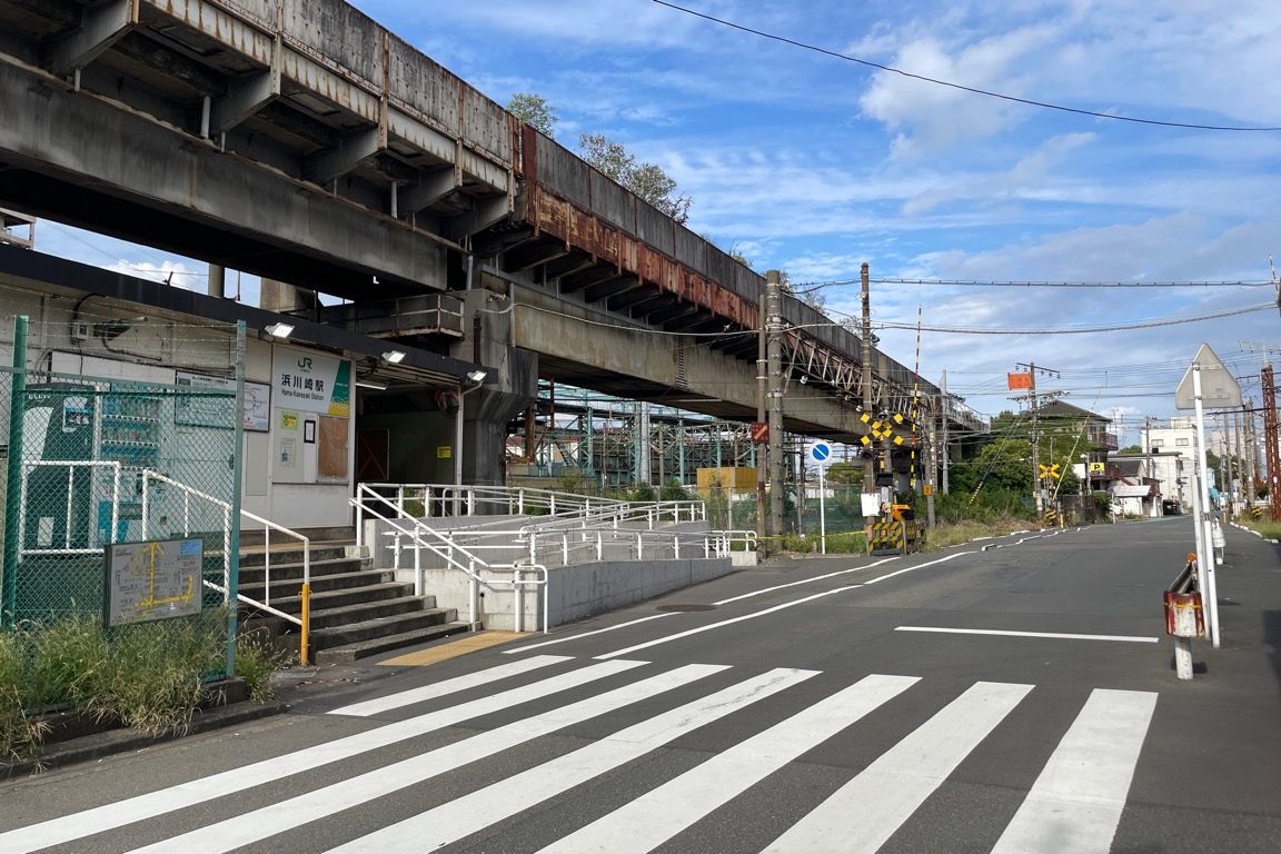 南武線側の浜川崎駅の駅舎の頭上には高架橋が通過している。これは東京貨物ターミナル側の東海道貨物線と鶴見線を直接繋ぐ短絡線の跡。駅舎頭上を通過した後、写真の道路と鶴見線を跨いで、徐々に地上に降りて行き、次の武蔵白石駅付近で鶴見線と合流する。現在は使用されておらず、高架橋にも草木が伸びているのが確認できた。