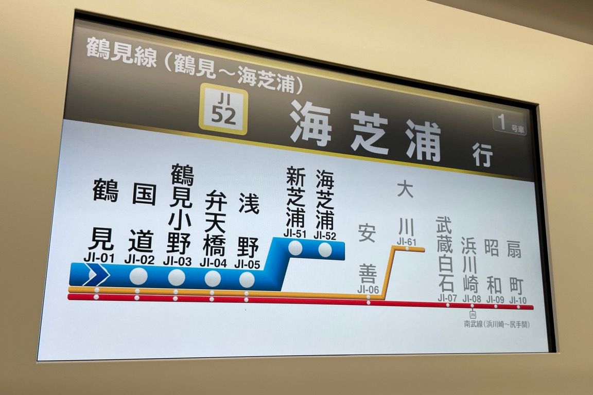 この次の弁天橋駅を出ると、列車はカーブして臨海部を離れ、鶴見の市街地へと入っていく。各駅から乗り込む人も多く、鶴見小野を発車した時点で、座席の大半は埋まったように見えた。鶴見川を渡り、国道を発車すると、国道15号線と、京急本線・東海道本線を跨いで鶴見駅に到着した。