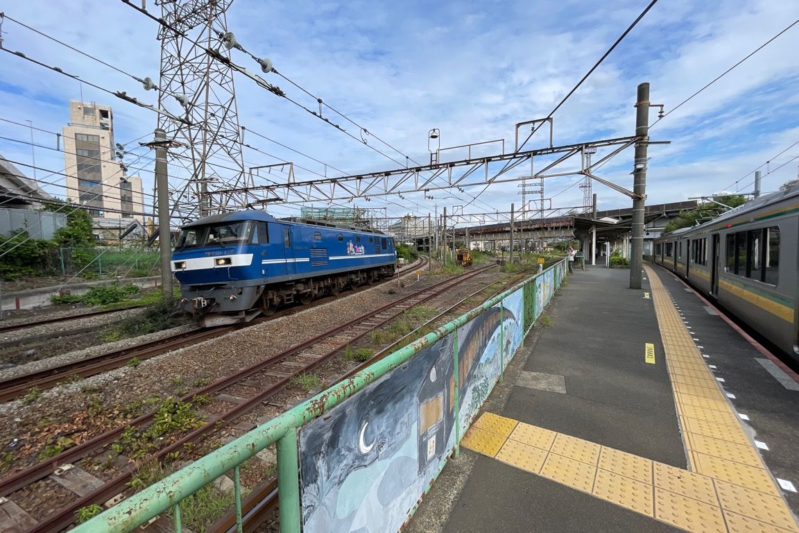 一旦改札を出て、鶴見線のホームへ歩く。ちょうど写真奥の踏切が鳴りだして、貨物列車が通過していった。多くの貨物列車が日中も走っているこの界隈。貨物列車ファンにとっては聖地であり、この日も写真や動画を撮る人の姿があった。発着線にはもう一本貨物列車の姿があったが、こちらも先発の貨物列車の数分後、後を追うようにして発車していった。