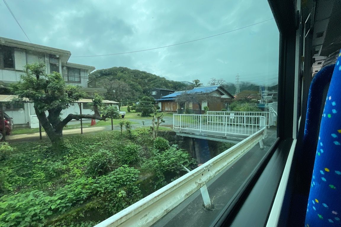 バスは5人ほどの乗客を乗せて発車。この便は途中の乗車がないため、これで最終的な乗車人数が確定ということになる。ロータリーを周回したバスは、下り坂を滑るように山を降りていく。普通便と同じ経路かと思えばそうではなく、大山駅バス停近くでも県道には入らず、そのままバイパスを直進。車窓の左側には、普通便が走る狭い県道と住宅が続く風景が見えた。対向車に気を配る必要がないため、バスは軽快に進んでいく。車内では、地元出身の噺家による大山観光案内の放送が流れ、観光地らしさを感じることができた。