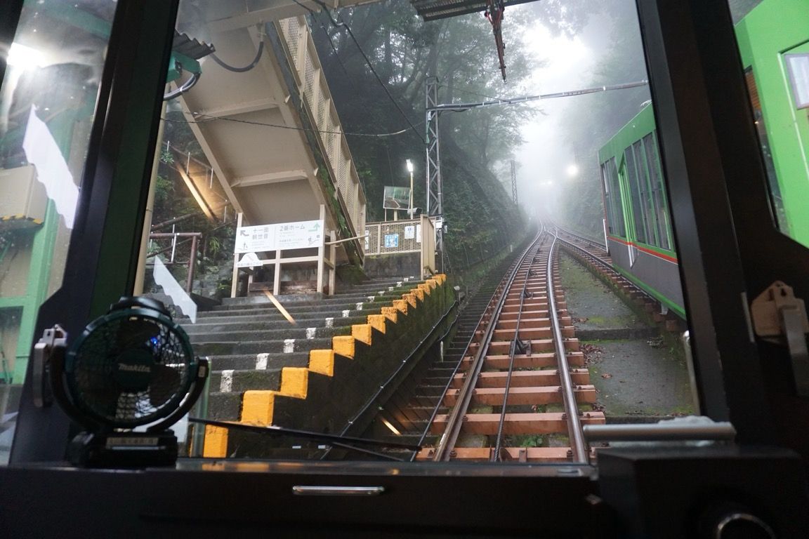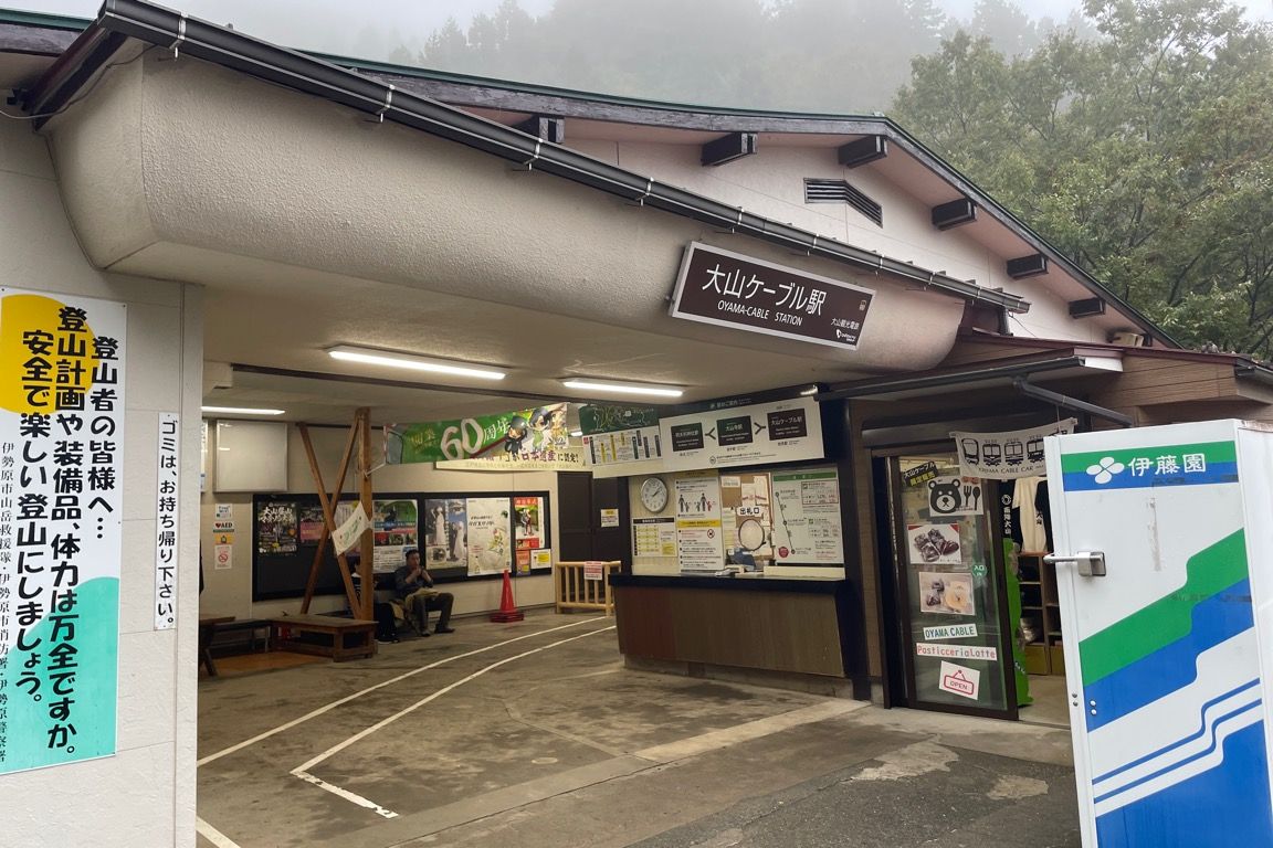 大山ケーブルバス停から15分ほど、息を切らしながら階段を上り続け、ようやく大山ケーブル駅に到着した。航空写真である程度距離があることは分かっていたが、ここまで階段続きとは知らず、思った以上に体力を消耗した。ちなみに翌日に乗車した筑波山ケーブルも、バス停から駅まで似たように階段が続いており、最後まで残った2路線はいずれも駅にたどり着くまでが大変な路線だった。