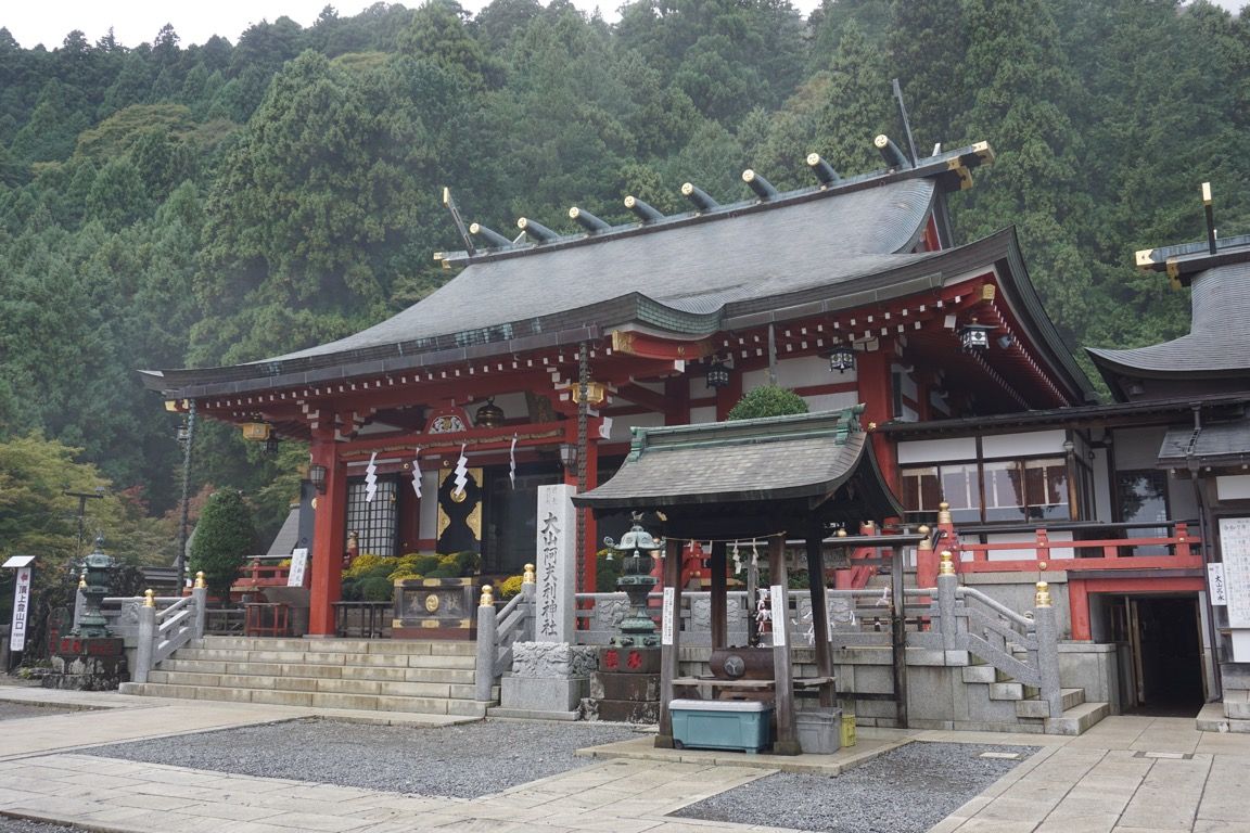 現在ケーブルカーが到着するこの場所は、標高約700mの大山中腹に位置する下社で、本社はさらに上の山頂付近に構える。かつてはケーブルカーの駅名も「下社駅」であった。社殿脇からは山頂への登山道が延びており、ここから本社までは約50分ほどの道のりとされる。また、社殿横の細い通路を進むと神泉があり、大山の名水が静かに湧き出ていた。