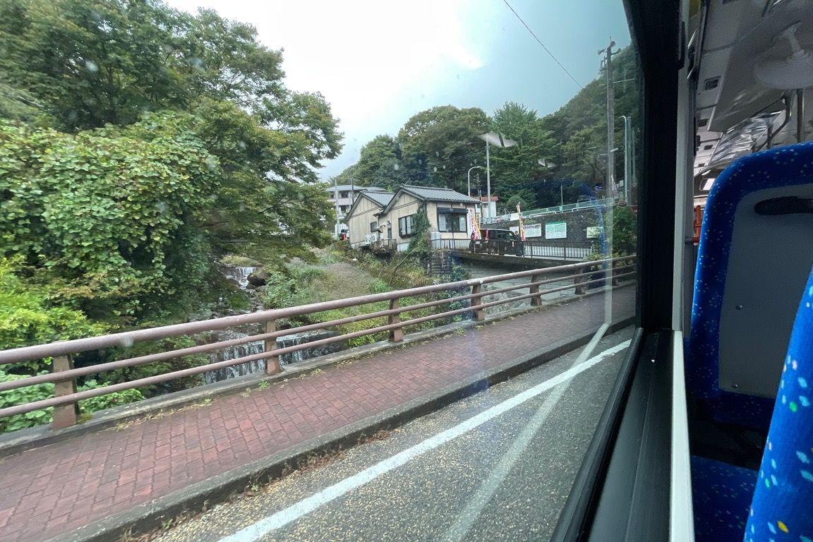 伊勢原駅北口からバスに揺られておよそ25分、大山ケーブルバス停に到着した。下車すると、大手私鉄の主要駅からバス一本で来たとは思えないほど、のどかな景色が広がっている。このあたりは広い土地がないため、バス停は鈴川の上にコンクリート製の構造物を築いて整備されたロータリーの上にある。バス停周辺では、下を流れる川のせせらぎが心地よく響いていた。