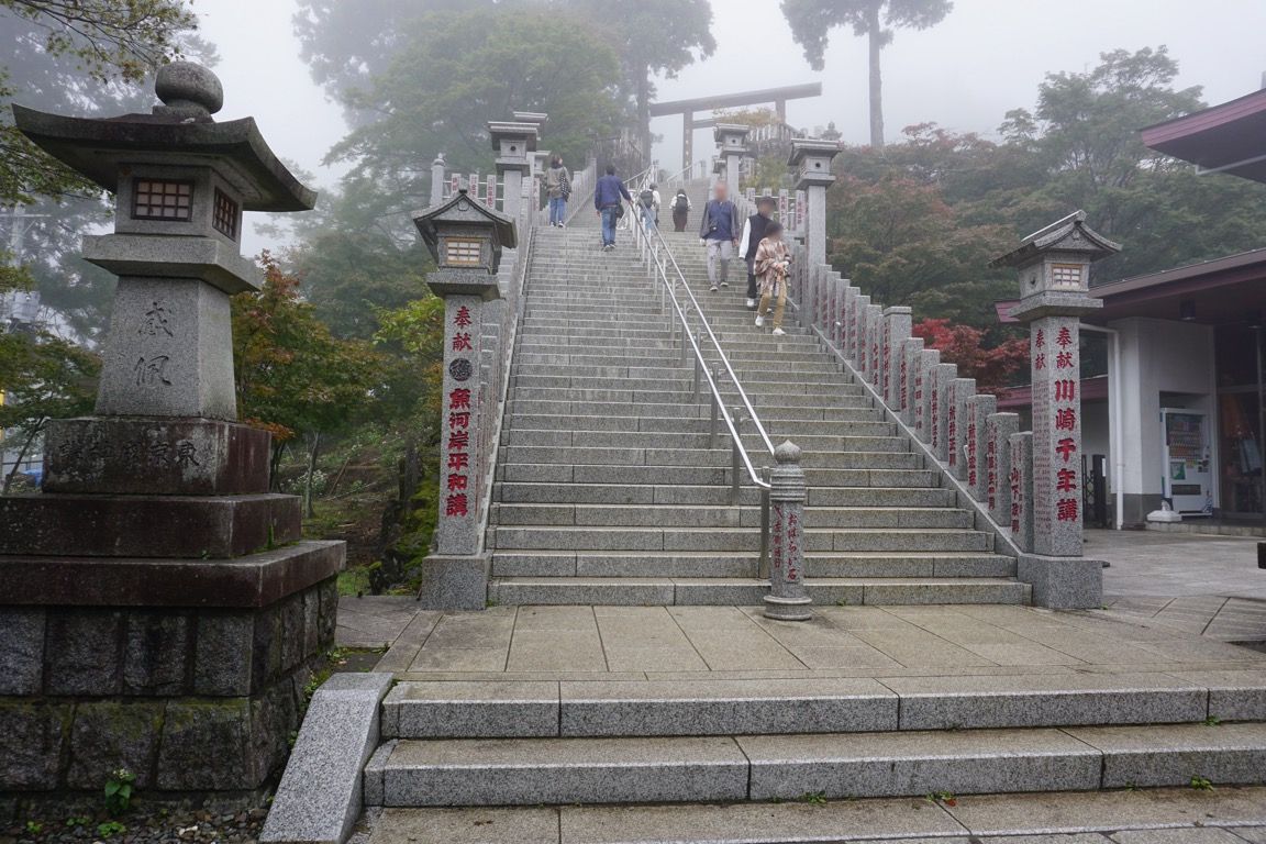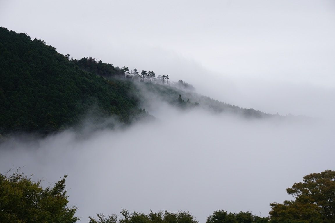阿夫利神社下社の大きな見どころといえば、やはり境内からの眺望である。晴れた日には湘南海岸、江の島、三浦海岸、さらには房総半島まで一望できるという。しかし、この日は雲が厚く広がり、期待した眺望は全く望めなかった。それどころか境内はときおり濃い霧に包まれ、数十メートル先の本殿さえ見えにくくなるほどだった。やがて霧が薄まると、眼下にはふわりと雲海が広がり、近くの山々が水墨画のように雲の間から姿を現した。晴れた日の絶景を楽しめなかったのは残念だが、「雨降山」という名にふさわしく、曇りや雨の日にこそ味わえる荘厳な雰囲気を堪能できた。