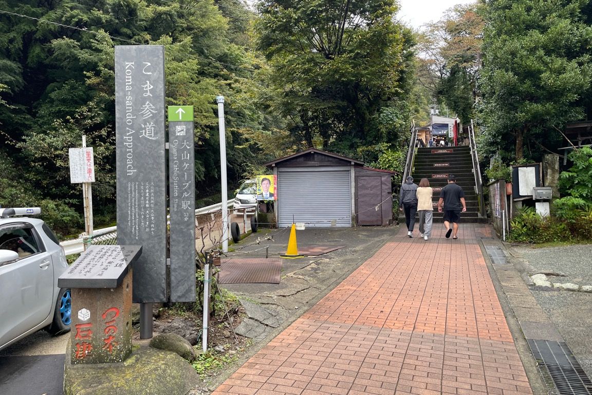降り立ったバス停の名前は「大山ケーブル」で、あたかもケーブルカー駅の目の前にあるかのような名称だが、実際にはここからケーブルカーの駅までは徒歩15分ほどかかる。すぐに乗れるわけではないため、訪れる際には計画に注意が必要である。なお、バス停周辺には駐車場が多数あり、自家用車で訪れた場合もここに車を置き、歩いてケーブルカー駅に向かうことになる。