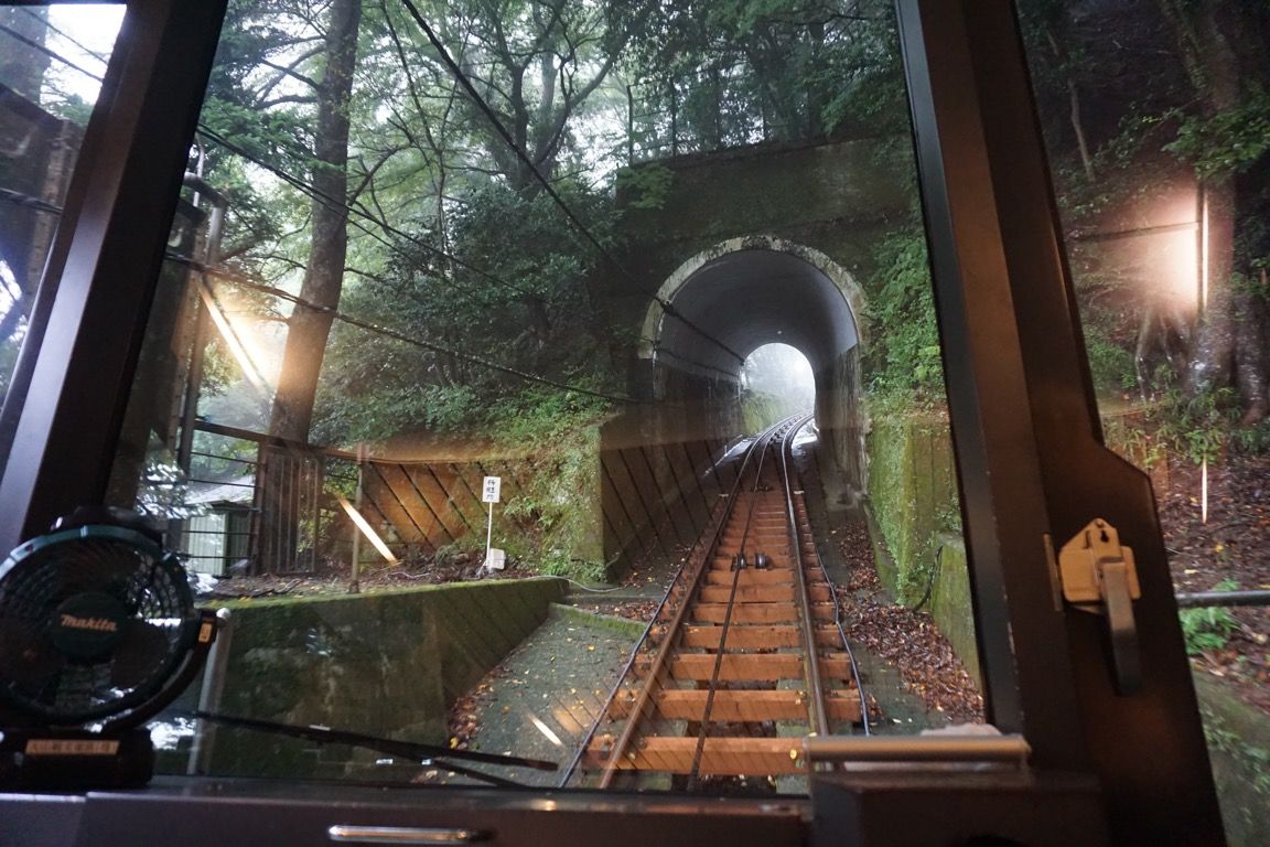 大山ケーブルには10人ほどが乗車し、扉が閉まるとまもなく発車した。大山ケーブル駅を出るとすぐに短いトンネルへ入っていく。この路線には2ヵ所のトンネルがある。途中にトンネルがあるケーブルカーに乗る度に思うのは、建設当時どのようにして掘り進めたのかということ。上の方から掘るのだろうか、それとも下の方から掘るのだろうか。いつも気になっている。