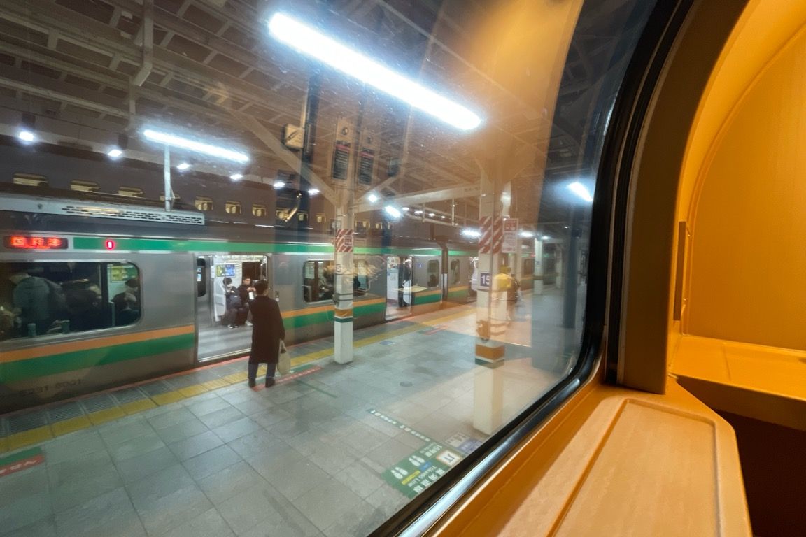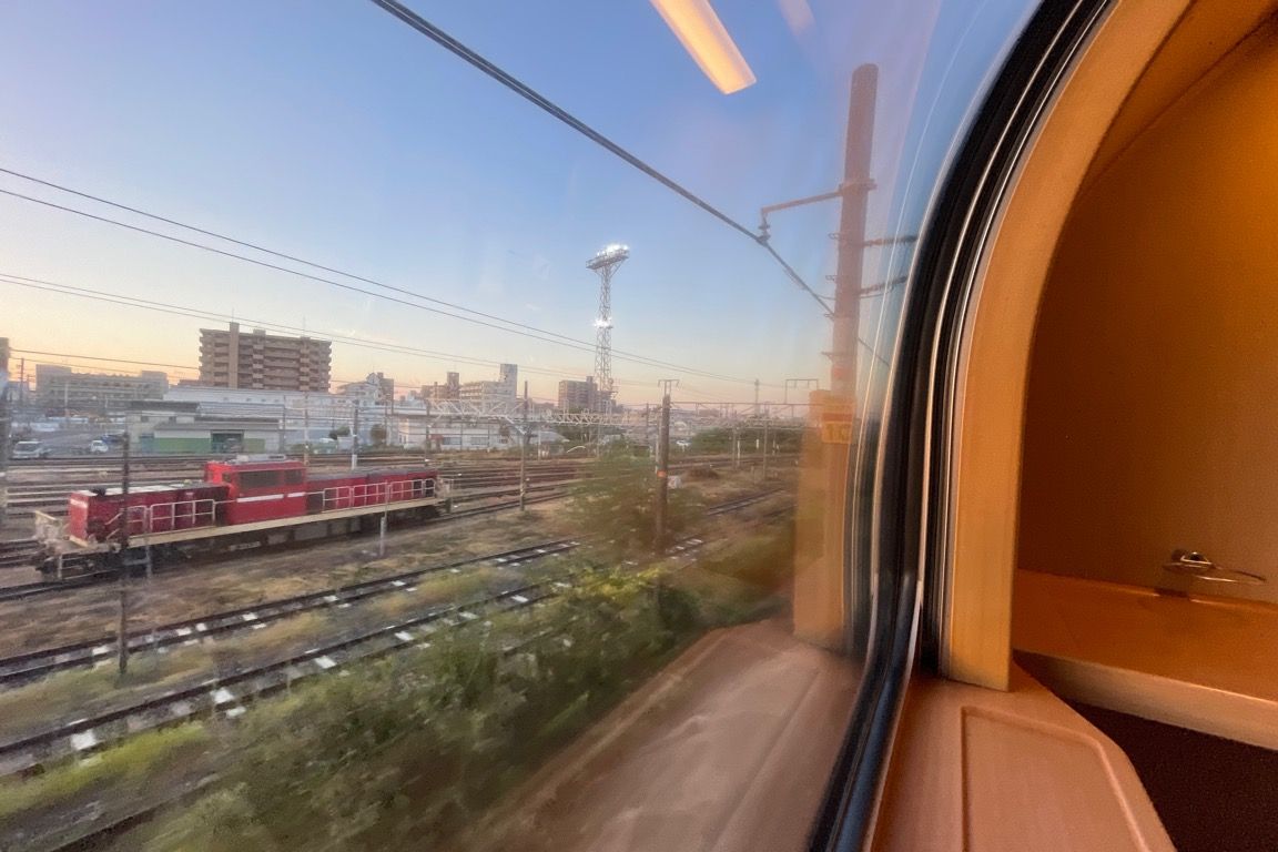 強い視線を感じ、一旦夕食を中断してスマートフォンを眺めるふりをする。東京駅でもそうだったが、ビジネス客らしき人たちが、何人かサンライズにカメラを向けている姿が印象的だった。この時間帯に毎日帰宅している人にとっては見慣れた存在なのかもしれないが、少し遅くまで仕事をした人にとっては、珍しい光景なのだろう。