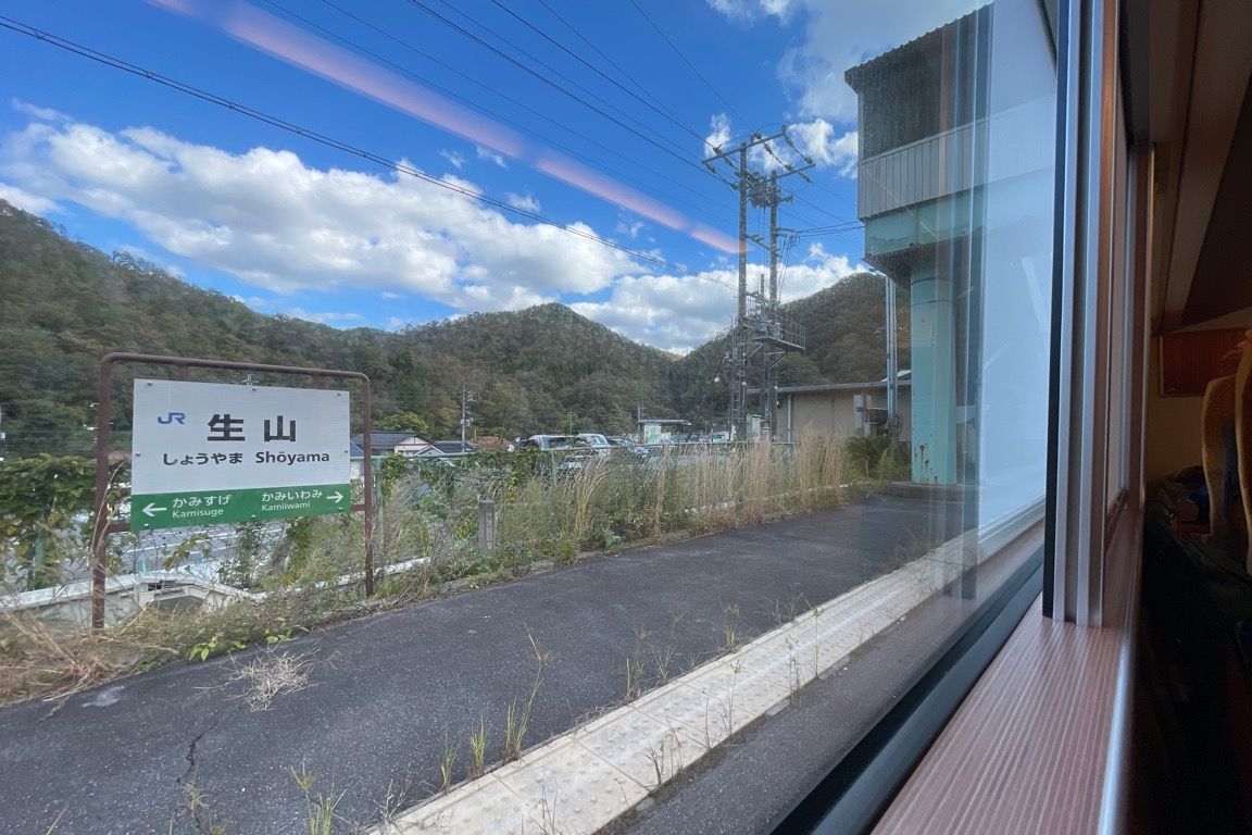 列車は生山に到着する。根雨と生山は千鳥停車となっており、多くの列車がどちらか一方に停車する。ホームでは、これから乗り込む人を見送る姿が見られた。特急停車駅ということもあり、小さな駅ながら指定席券売機が設置されている。九州でも以前に比べれば設置は進んだが、伯備線沿線では新見や備中高梁といった中規模以上の駅でなければ、あまり見かけない設備である。