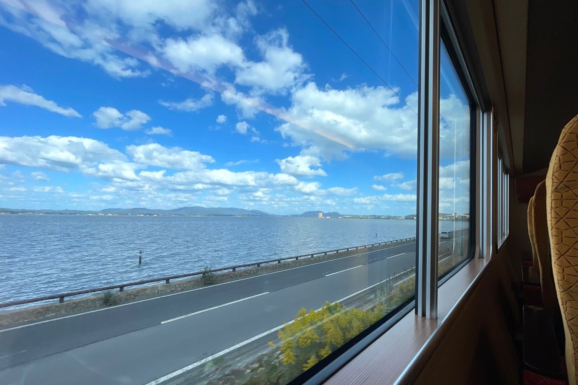 松江を発車すると、列車は宍道、安来を経て米子へ向かう。市街地を抜けると大橋川が現れ、やがて中海が車窓いっぱいに広がる。