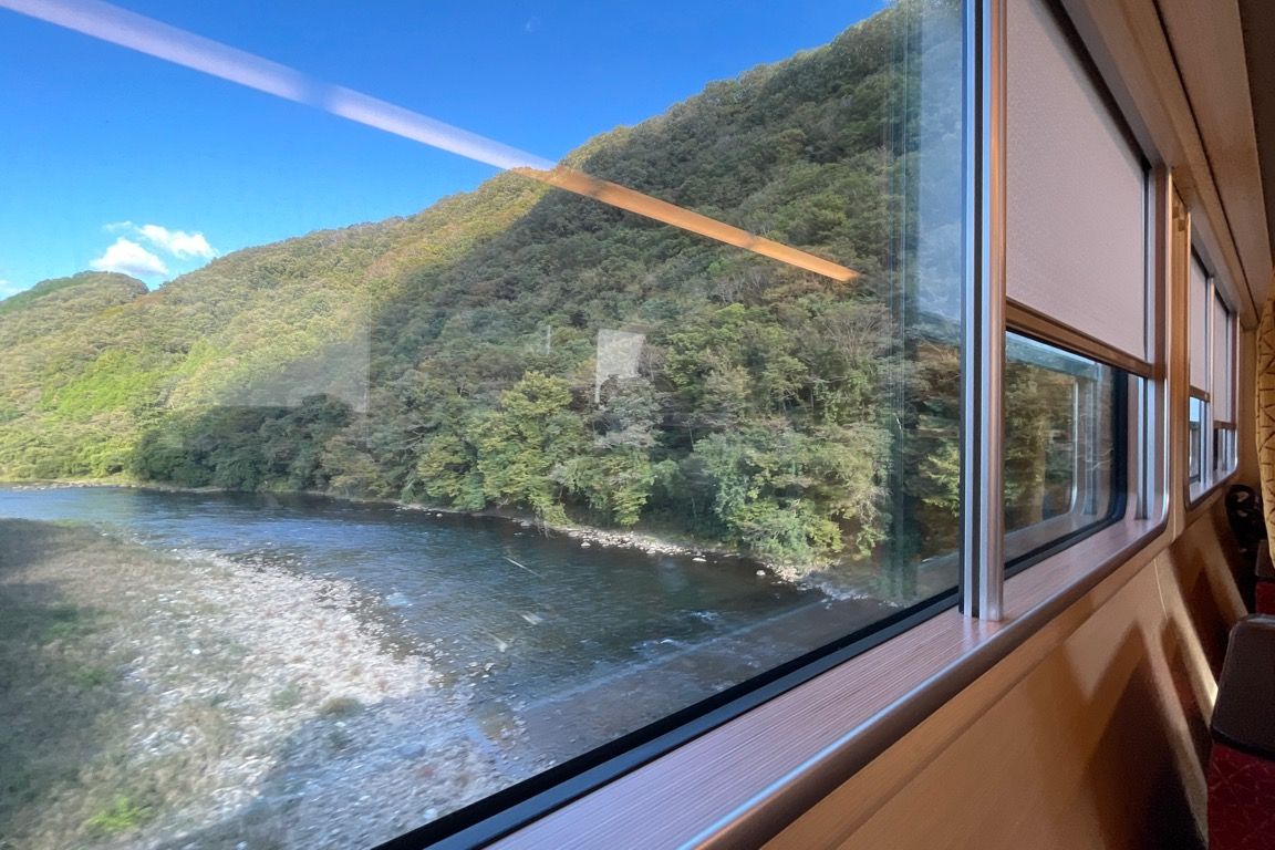 川は進行方向右手に並走する区間が多く、こちら側の車窓は基本的に崖や森が続く。今回は朝のサンライズ出雲で反対側の車窓を十分に眺めていたこと、そして日差しの向きも考えてあえてこちら側の座席を選んだが、単体での乗車であれば、反対側の方が景色は良いだろう。