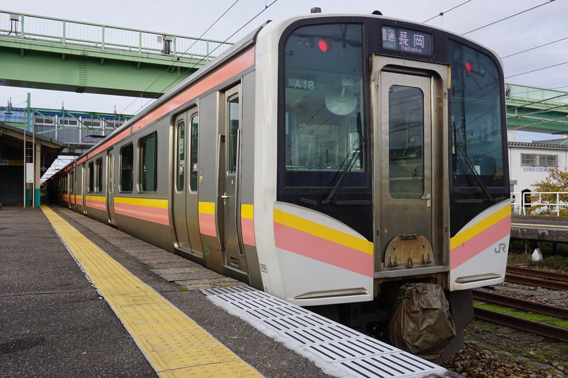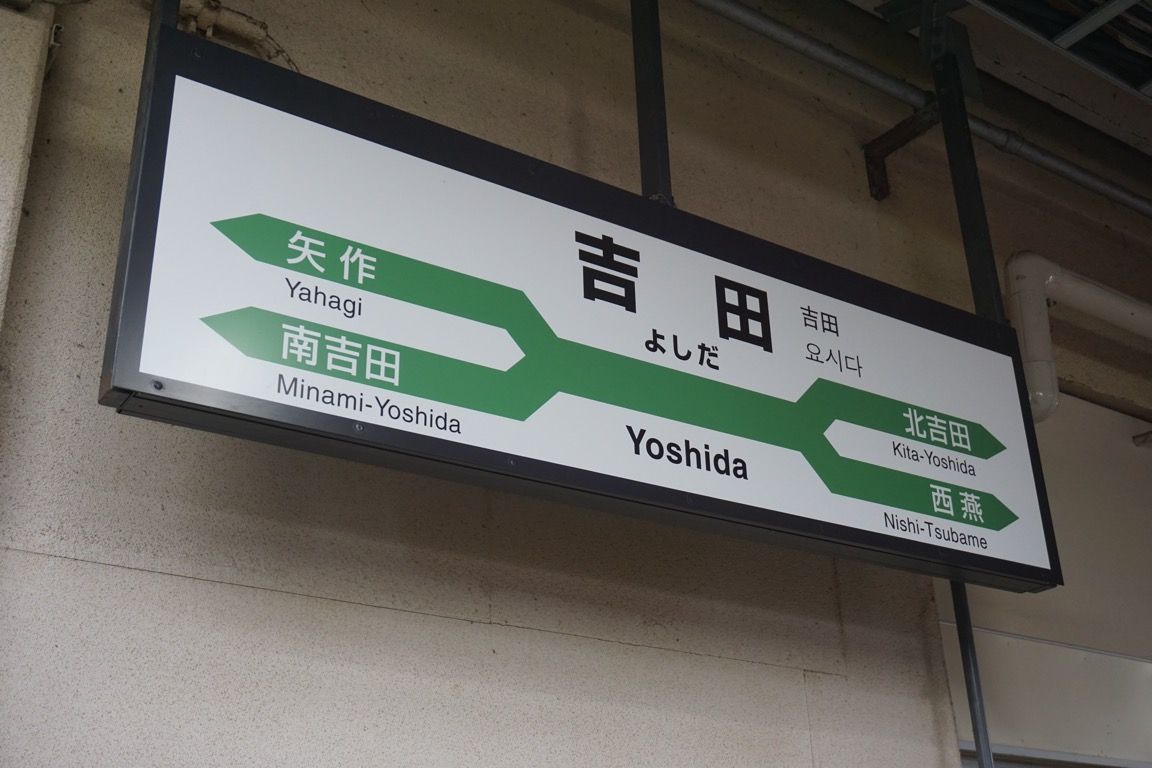 新潟から57分で終点の吉田に到着。向かいのホームには、まもなく柏崎始発で弥彦線へ直通する東三条行きの普通列車が入線し、何人かの乗客がそちらへ乗り換えていった。一方、先ほどまで乗車していた列車は、折り返し普通長岡行きとして新潟方面へ戻っていく。長岡は、今いる吉田よりもさらに南に位置する街であり、この列車は吉田から新潟を経由して長岡へ向かう、いわば「し」の字を描くような少し風変わりな運行経路となっている。