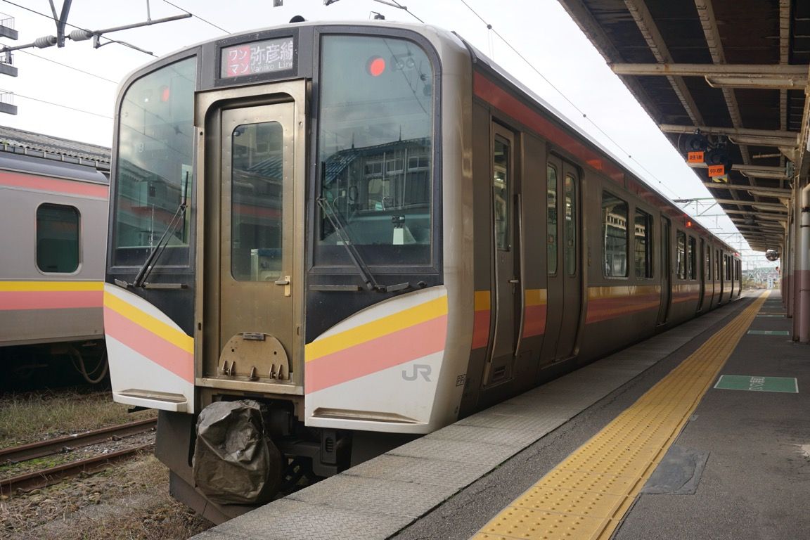 弥彦での散策時間も確保したいと考え、当初は柏崎まで往復してから弥彦へ向かい、その後東三条へ抜ける計画を立てていた。しかしこの日は、弥彦線で臨時列車が運転されていた影響で、一部列車に行先変更が発生していた。そこで計画を見直し、吉田から先に弥彦へ向かい、その後東三条へ進み、折り返して吉田に戻ってから柏崎へ向かう行程に変更した。