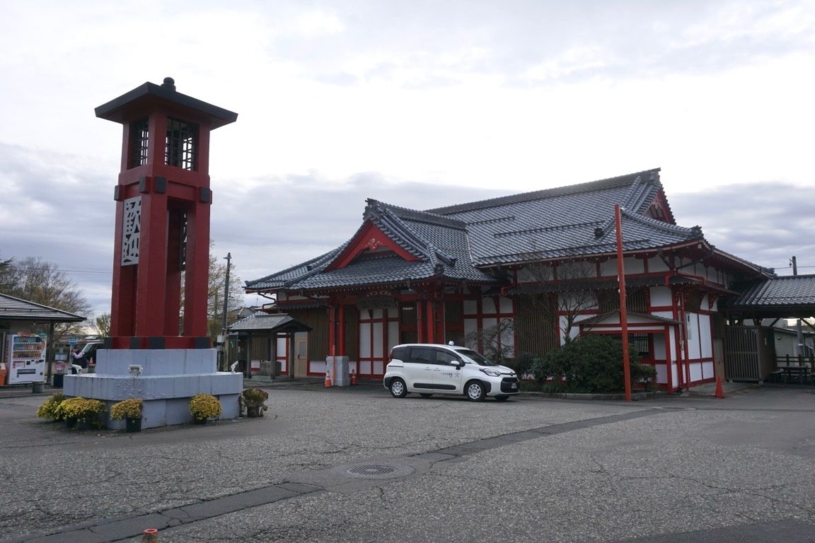 吉田から10分もにしないうちに弥彦に到着。弥彦線の線路はここで行き止まりとなっていて、終点感が漂うが、この路線はここが起点である。ホームの横には神社風の駅舎が建っている。平日は無人駅だが、土休日や多客期には駅員が配置される。ただし、窓口営業は行われておらず、改札のみの営業である。