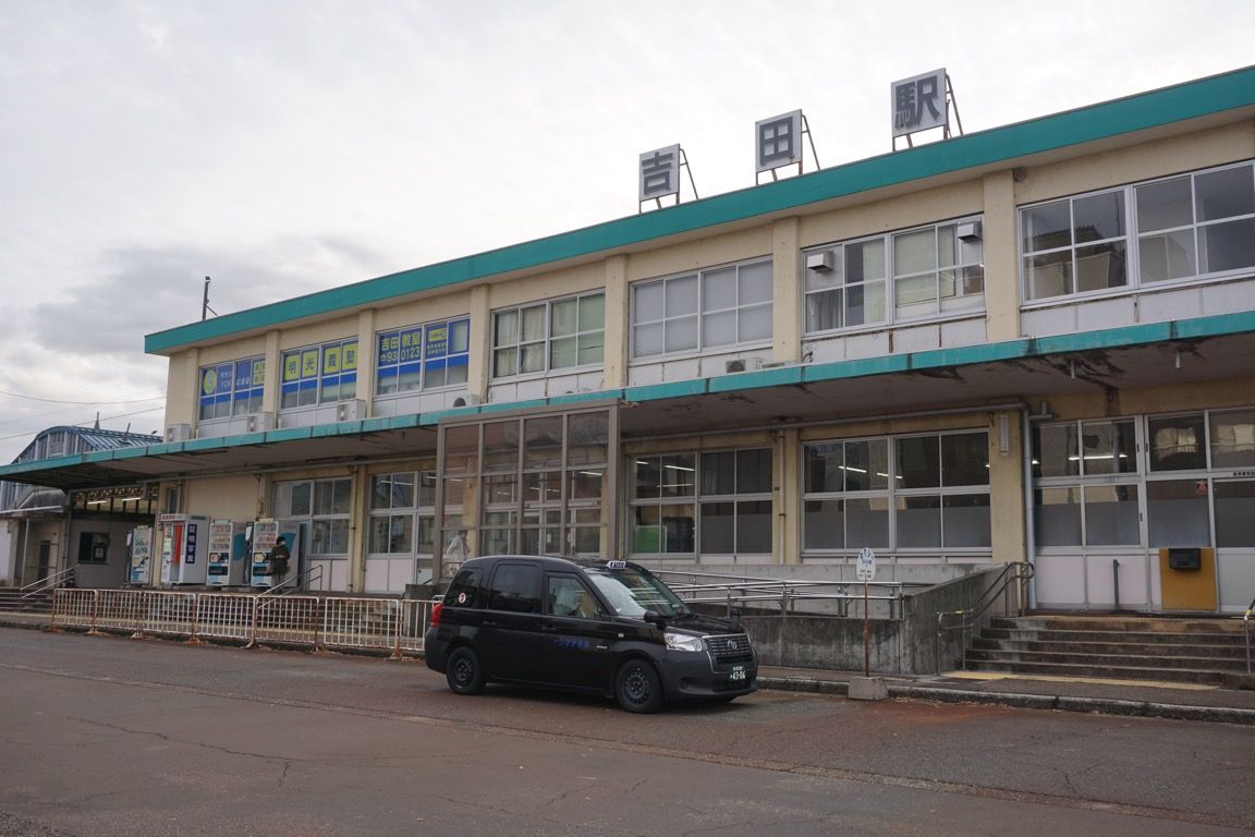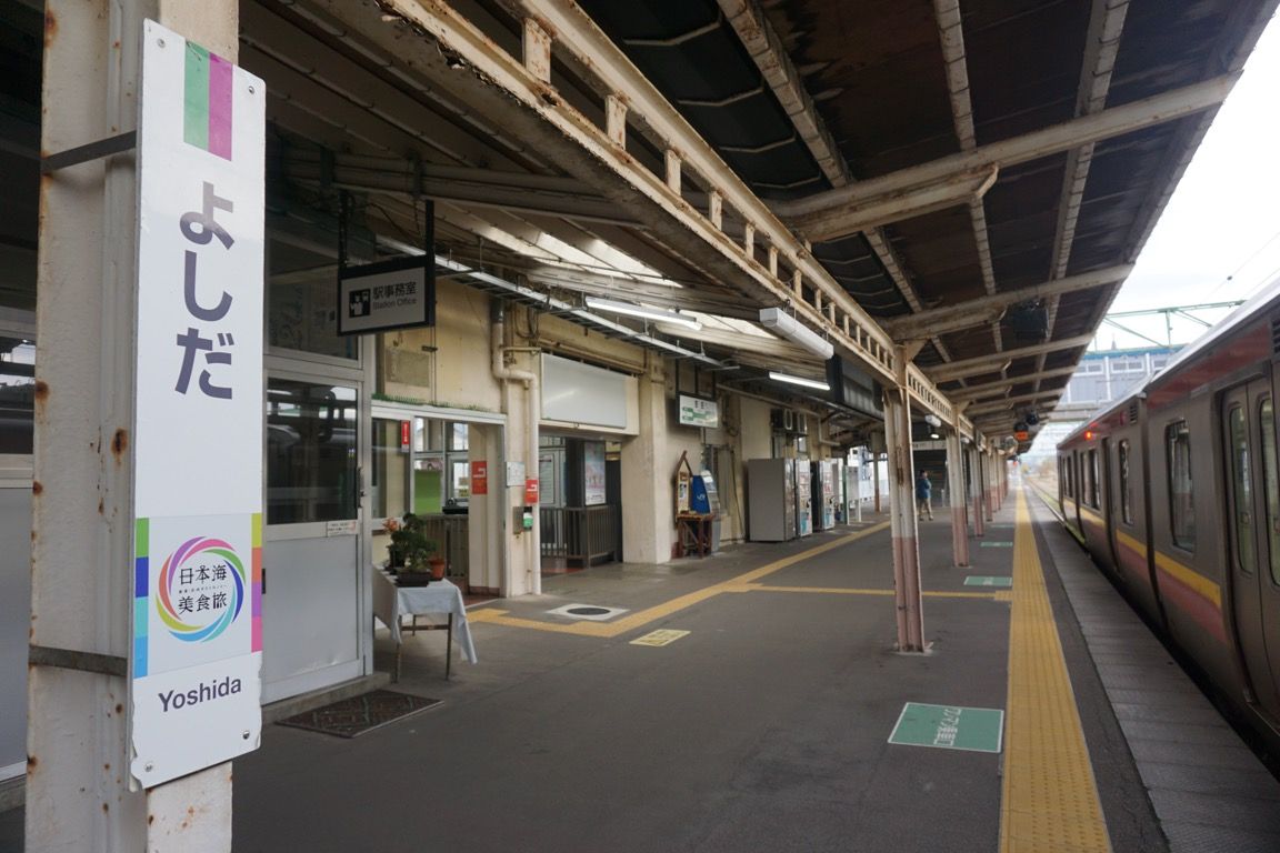 次の列車まで少し時間があったため、一旦駅の外へ出てみた。吉田駅は、いかにも日本海側の国鉄駅らしい佇まいで、以前訪れた羽越本線・米坂線の坂町駅によく似た雰囲気を持っている。信号扱いの関係で駅員は常駐しているものの、みどりの窓口はすでに廃止され、指定席券売機が1台設置されているのみである。この地域から鉄道で遠方へ向かう場合、燕三条まで車で出る人も多いのではないか、そんなことを想像した。