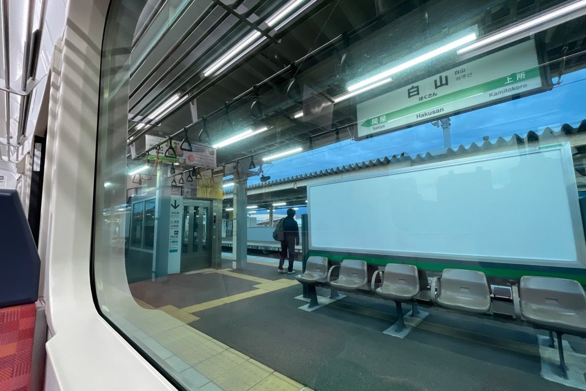 上越新幹線の「とき302号」東京行きと並んで新潟を発車。しばらくは市街地の街並みを眺めながら高架線を進み、新幹線が次第に遠ざかっていくのと同時に、こちらは地上へと下りていく。まもなく最初の停車駅、上所に到着。上所は、今年(2025年)3月に開業したばかりの新駅である。