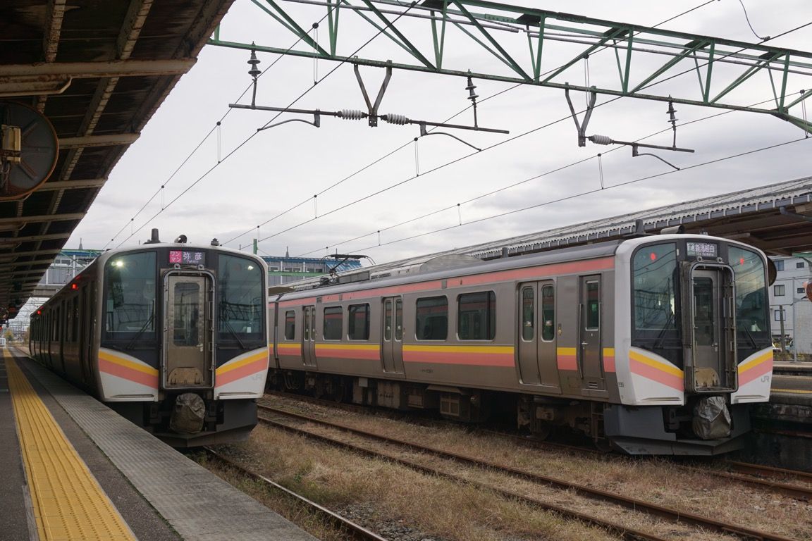 この日最初の乗車路線は越後線である。柏崎を起点に、吉田を経由してここ新潟へ至る路線で、信越本線のやや北側を並走するように走っている。新潟―柏崎間には信越本線もあるが、長岡・新津を経由する同線がちょうど100kmであるのに対し、越後線は83.8kmと15km以上短い。