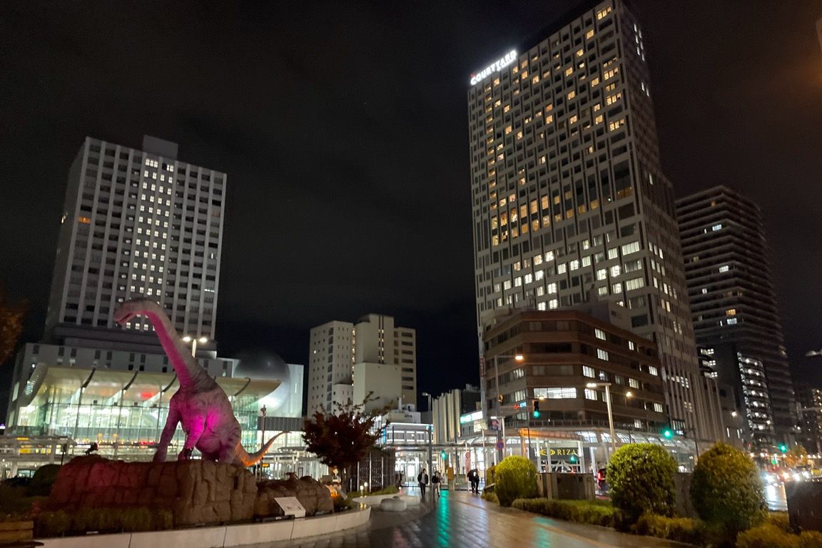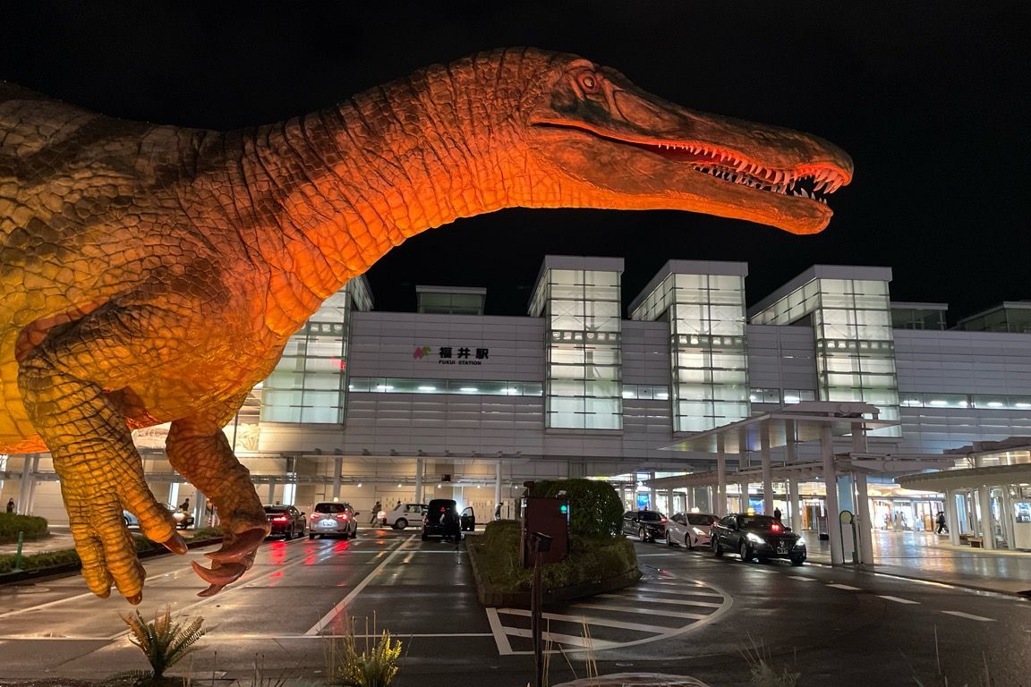 何より目を引くのは、駅前に設置された恐竜のオブジェである。リアルに動き、鳴き声まで響く恐竜がライトアップされている。駅周辺に目立った観光スポットが少なかった福井駅だが、この恐竜たちが、今では立派な観光スポットの役割を果たしている。