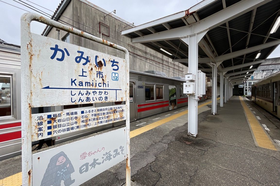 列車はやがて上市に到着。宇奈月温泉から黒部川に沿って北上し、黒部市街地付近で西へ進路を取り、その後南西から南へと向きを変えてきた地鉄本線は、ここ上市で東を向く。駅名標が示す通り、この駅はスイッチバック構造となっており、電鉄富山・宇奈月温泉の両方面の列車がいずれも西側から進入し、ここで進行方向を変える。これが地鉄本線の大きな特徴の一つである。