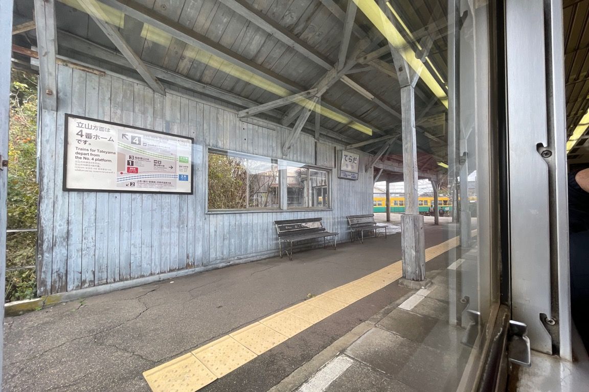 上市から10分ほどで列車は寺田に到着する。ここ寺田は立山線が分岐する駅である。電鉄富山〜立山間の列車には、昨年(2024年)5月のアルペンルートの旅で乗車しているため、この駅への到着をもって、ついに富山地方鉄道本線、そして富山地方鉄道全線の完乗を達成した。
