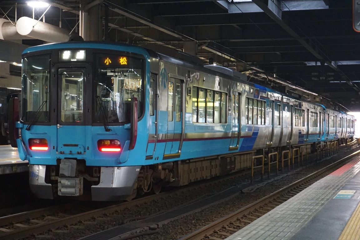 先発列車に比べればやや空いてはいたものの、それでも多くの乗客を乗せて金沢を発車する。先ほどまで青空が広がっていた金沢だったが、西から発達した雨雲が近づき、西金沢を過ぎたあたりから本降りの雨となった。小松付近で完全に日が暮れ、その後は夜間走行となる。