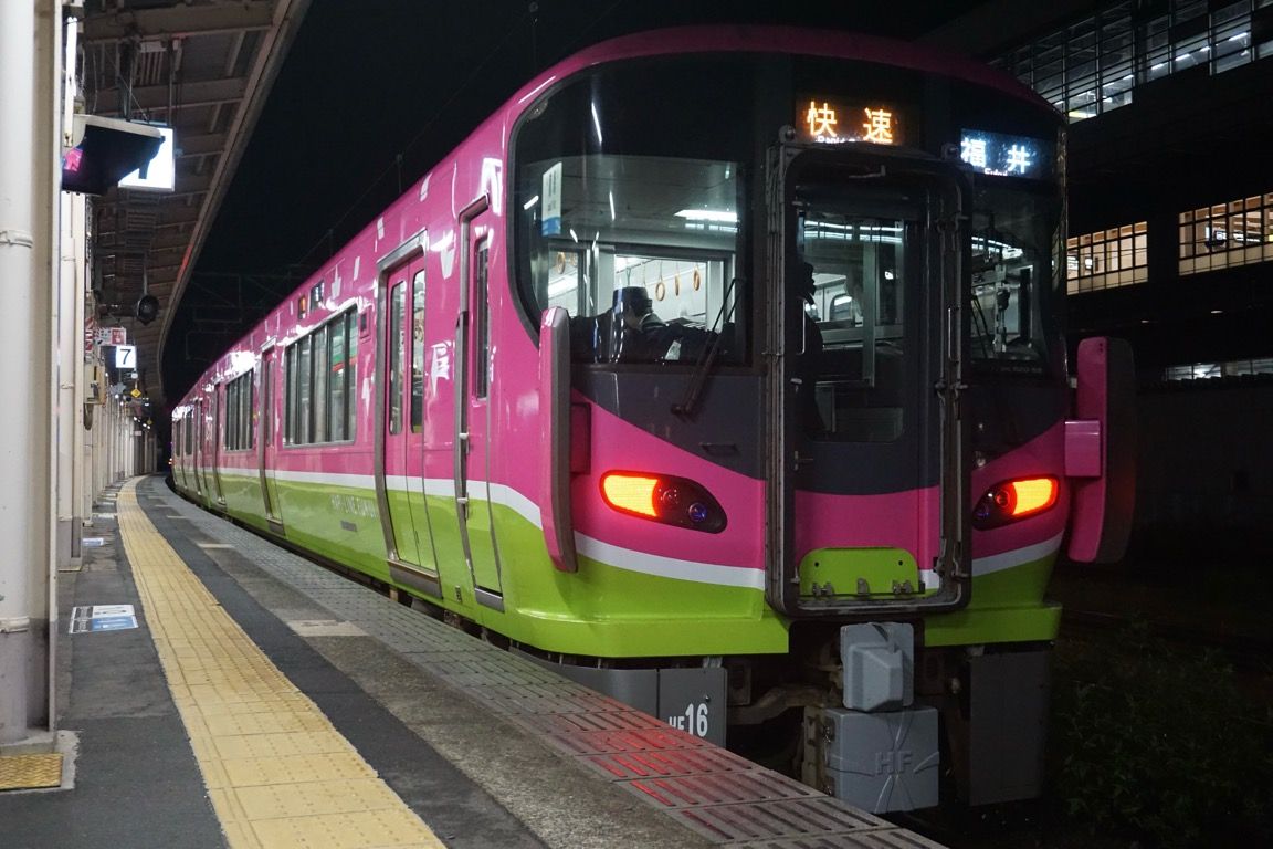 さて福井では、普通列車を3本ほど見送ったのち、18時48分発の快速敦賀行きに乗車した。ハピラインふくい線の福井-敦賀間では、朝夕を中心に快速列車が運転されている。運転本数は1日4.5往復。ラッシュ時の速達輸送を担うと同時に、早朝・深夜帯の1往復は米原まで無停車で走る北陸本線の臨時快速と接続し、新幹線が運転されていない時間帯の福井-名古屋・東京間の移動も支える役割を持つ。筆者が乗車したのは、夜の帰宅時間帯に運転されている敦賀方面行きの最初の快速列車だった。