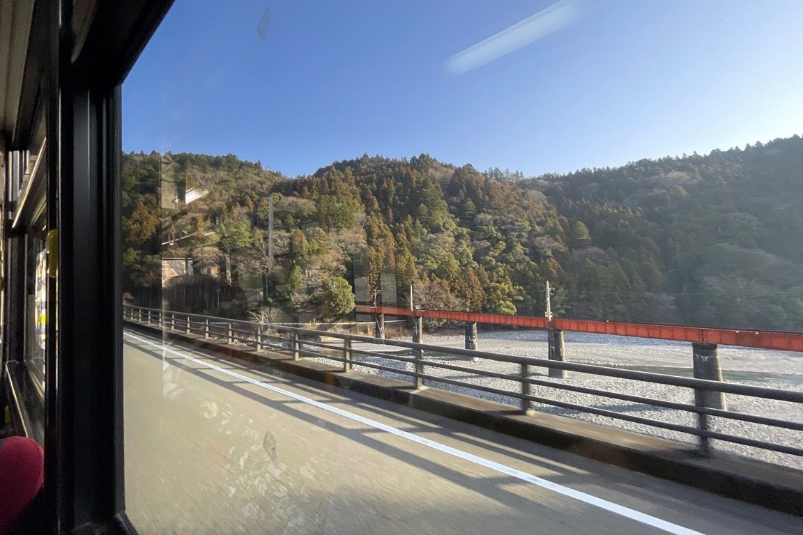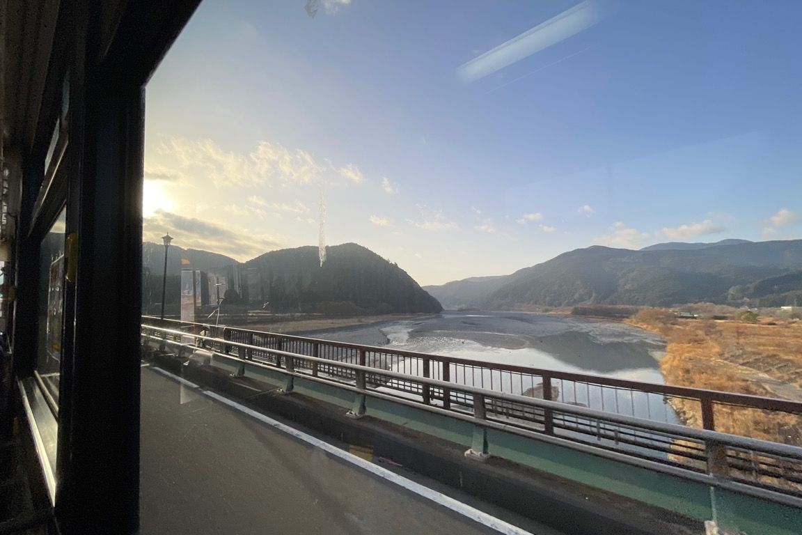 やがてバスは大井川に架かる駿遠橋を渡る。かつて大井川は駿河と遠江の国境であった。橋の名はそこに由来するのだろう。水面は朝日を受け、周囲の山々を静かに映し込んでいる。