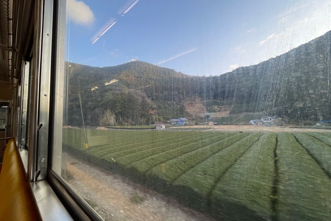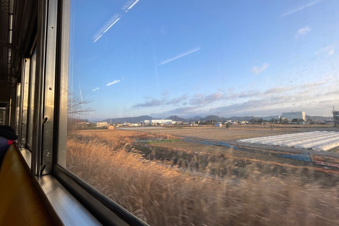 新金谷を出ると、列車は代官町、日切、合格と停車していく。金谷の市街地を抜けると、車窓には郊外の風景が広がる。朝日を浴びながら、ジョイント音を響かせて、列車は走る。
