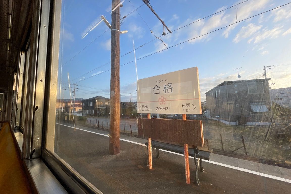 日切を出ると、次は合格に停車する。もともとは五和(ごか)と読んでいた駅名を、隣に門出駅が開業したのに合わせて改称し合格と名乗るこの駅。門出駅と並んで、縁起の良い駅名として知られている。受験シーズンということもあり、翌日の帰路ではこの駅から乗車し、金谷駅で記念にきっぷを持ち帰りたいと申し出る乗客の姿もあった。