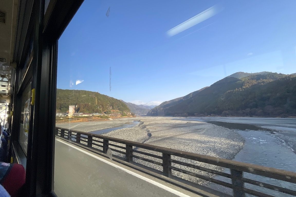 門出を出てしばらくすると、いよいよ車窓には大井川が広がり始める。金谷郊外の風景はここで終わり、ここから終点千頭までは、多くの区間で大井川を眺めながら走る。現在運行されている区間では、川は進行方向右側に広がる。対岸には住宅地が点在する一方、こちらは山の斜面を縫うように走っていく。