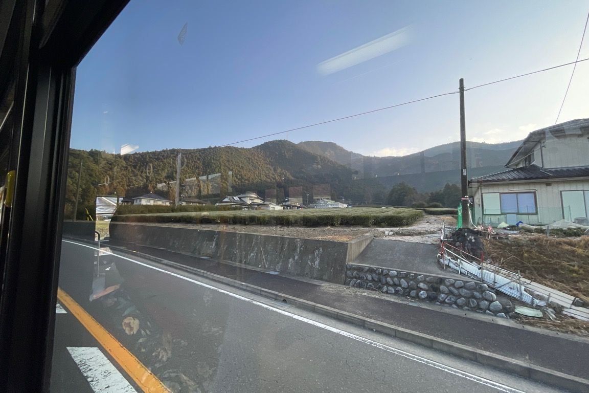 地名のバス停では1人が乗車した。まだ山陰にある茶畑には朝の光が届かず、葉の先には夜の名残の露がきらりと光っている。静まり返った冬の山あいに、ひんやりとした空気が漂っていた。
