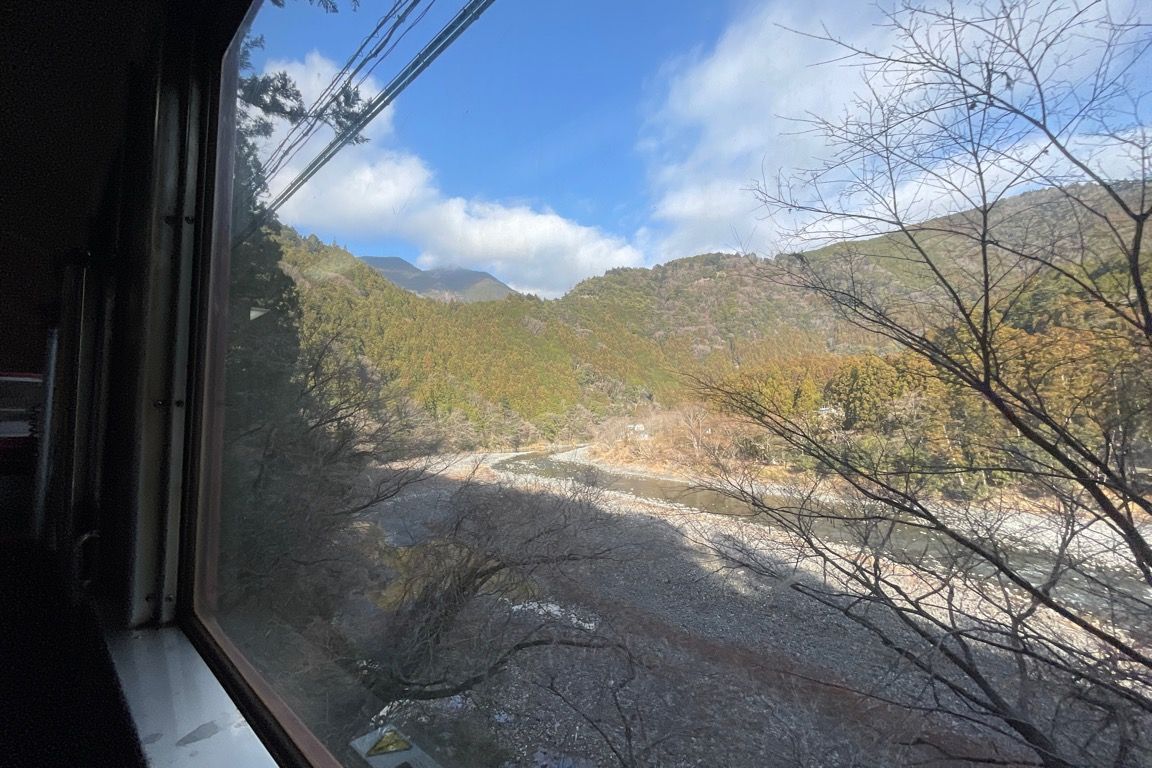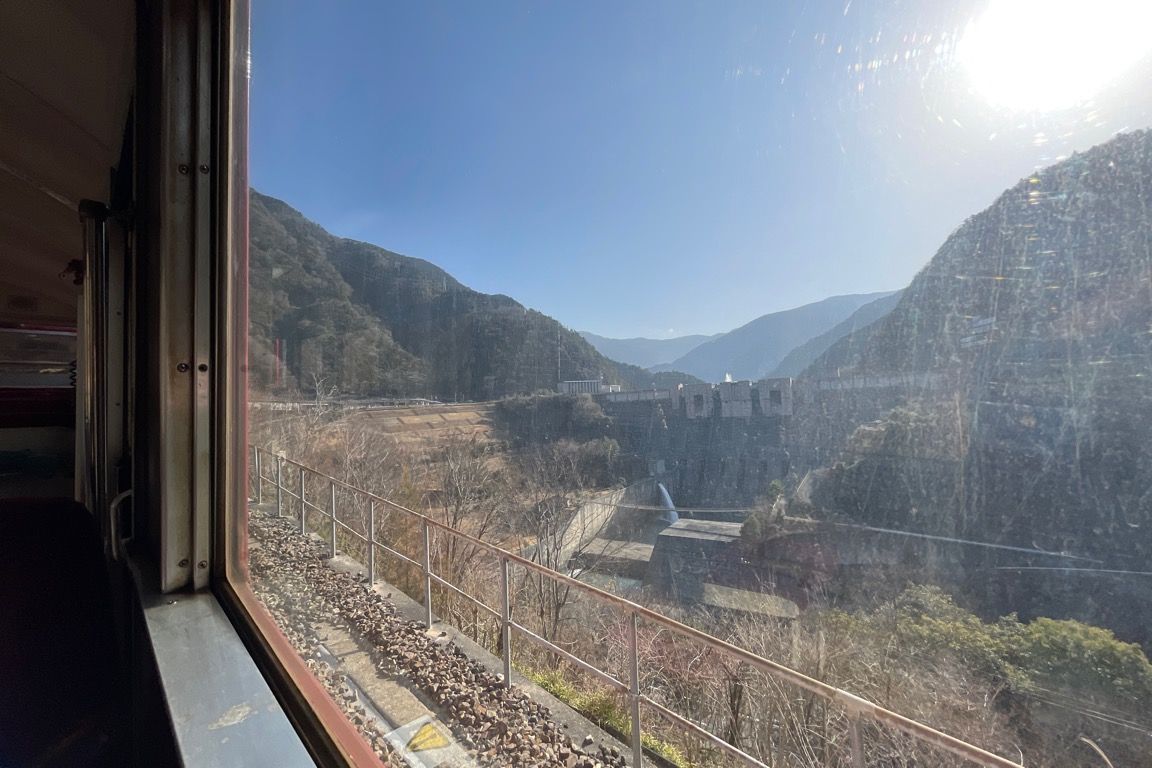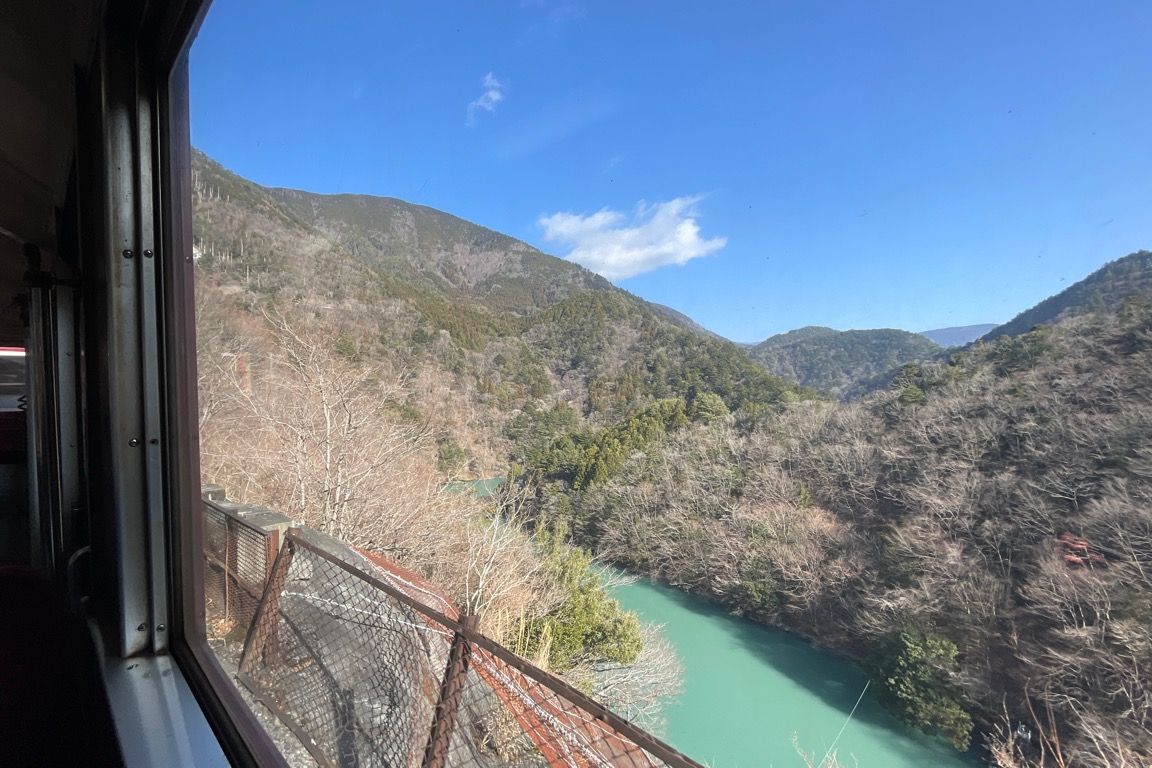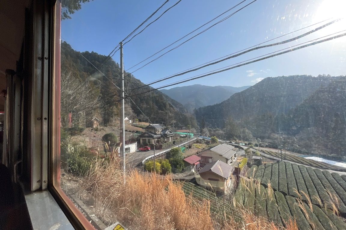 川根両国を出ると、車両基地を横目に進み、再び大井川に沿って走る。頭上を吊り橋が横切っていく。やがて大井川が車窓いっぱいに広がると、車掌による案内放送が流れた。川の奥、雲のかかる山の麓に見えるのが寸又峡温泉。その少し右手の山麓にあるのが、この列車の終点、井川だという。千頭から井川までは路線長こそ25kmあるが、山に沿って大きく迂回している区間が多く、直線距離ではわずか14kmほどしかない。東京で例えるなら、東京から蒲田、あるいは品川から池袋ほどの距離である。列車はその距離を2時間近くかけて進んでいく。