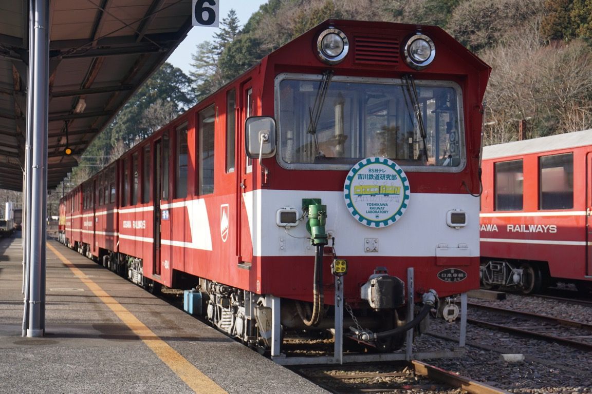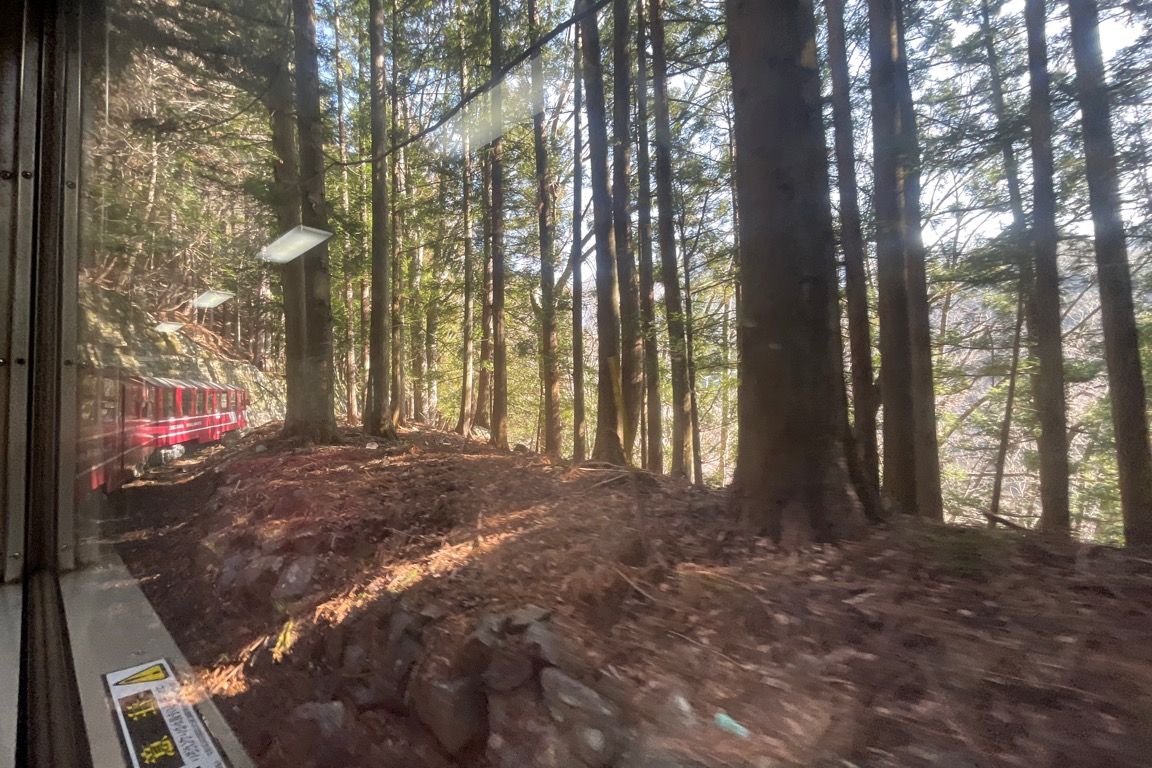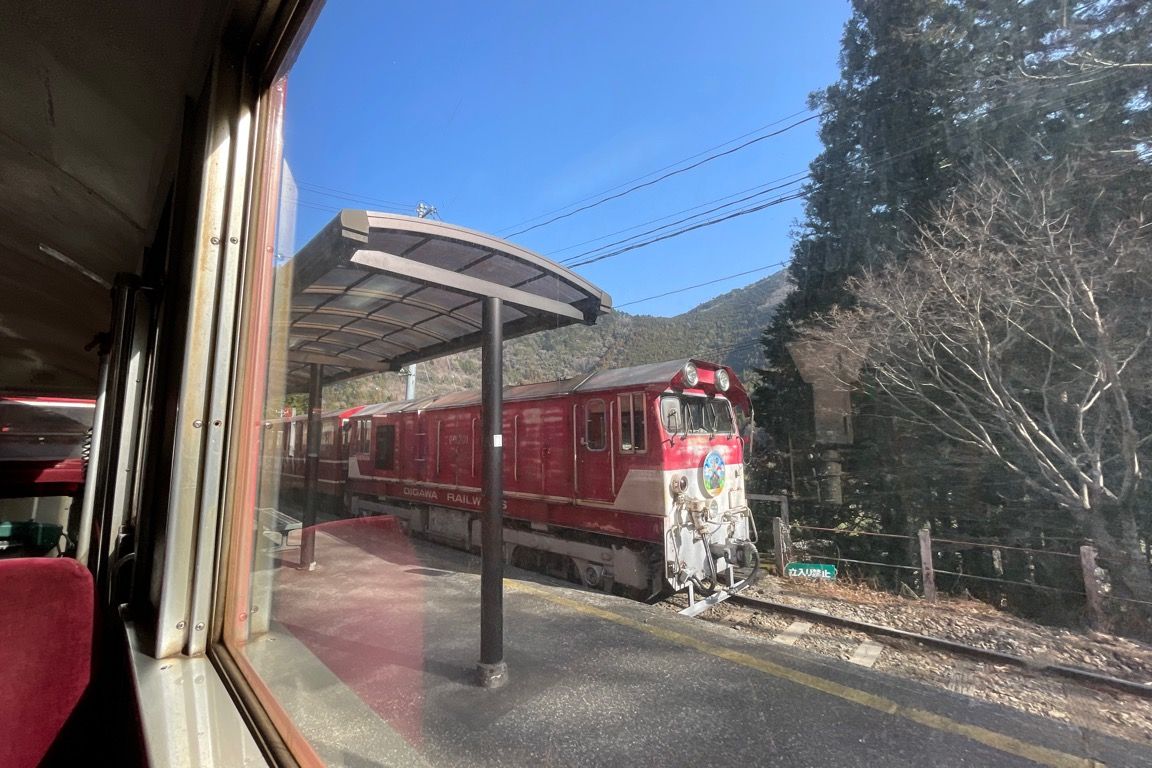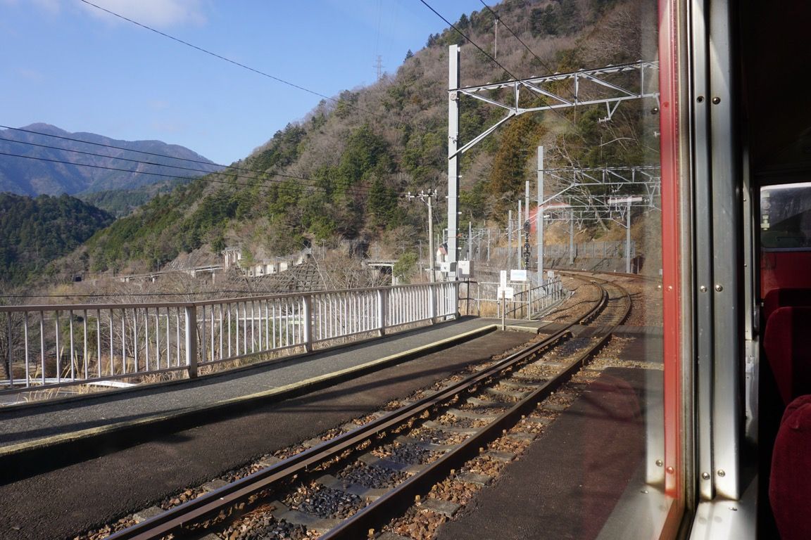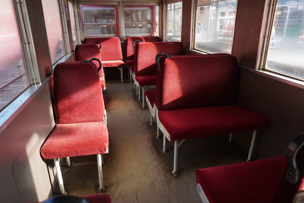 筆者は最後尾の車両に乗車した。やがて車掌が検札に回ってくる。「前の車両は暖房がついておりますので…」という案内で、乗車した車両には暖房がないことに気づいた。移動しようかとも思ったが、暖房がない車両はおそらく誰も選ばないだろうと考え、そのまま留まることにした。この日は寒気がやや緩み、停車中はそれほど寒さを感じなかったが、走行中は日陰を進む区間が多く、冷気が身に沁みる。それはそれで冬の旅らしく悪くない。