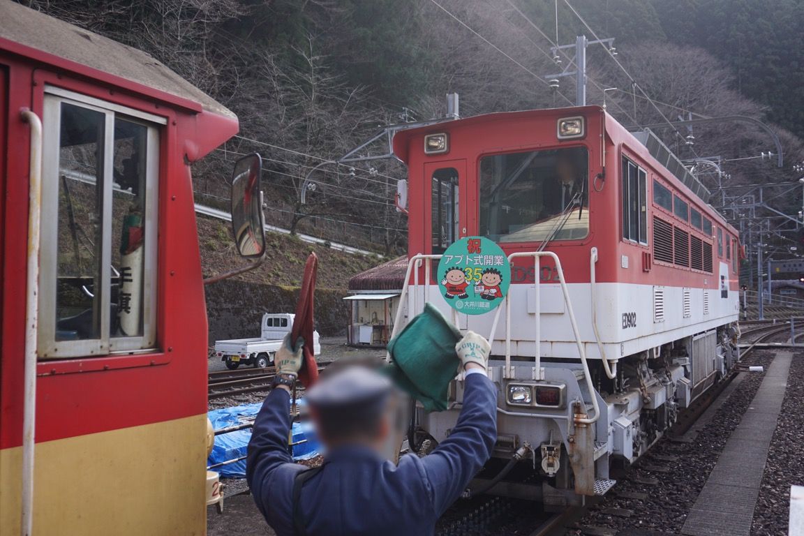 乗ってきた客車自体がアプト式に対応しているわけではない。アプトいちしろ駅では、車両後部にアプト式対応の機関車を連結し、この機関車に長島ダムまでの急勾配区間を押し上げてもらう。