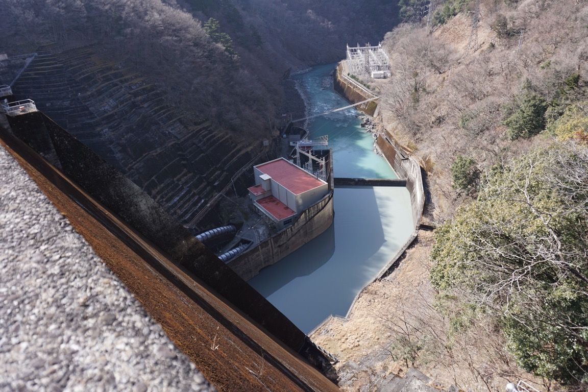 堤体上の県道からは下をのぞき込むことができる。100mを超える高さは、見下ろすと身がすくむほどだった。眼下に見える建物が発電所で、その奥には送電設備も確認できる。ちなみにこの付近を走る井川線は、ダム堤体よりもさらに高い位置を通っている。山肌に張り付くように延びる線路を見れば、その高さがよく分かる。