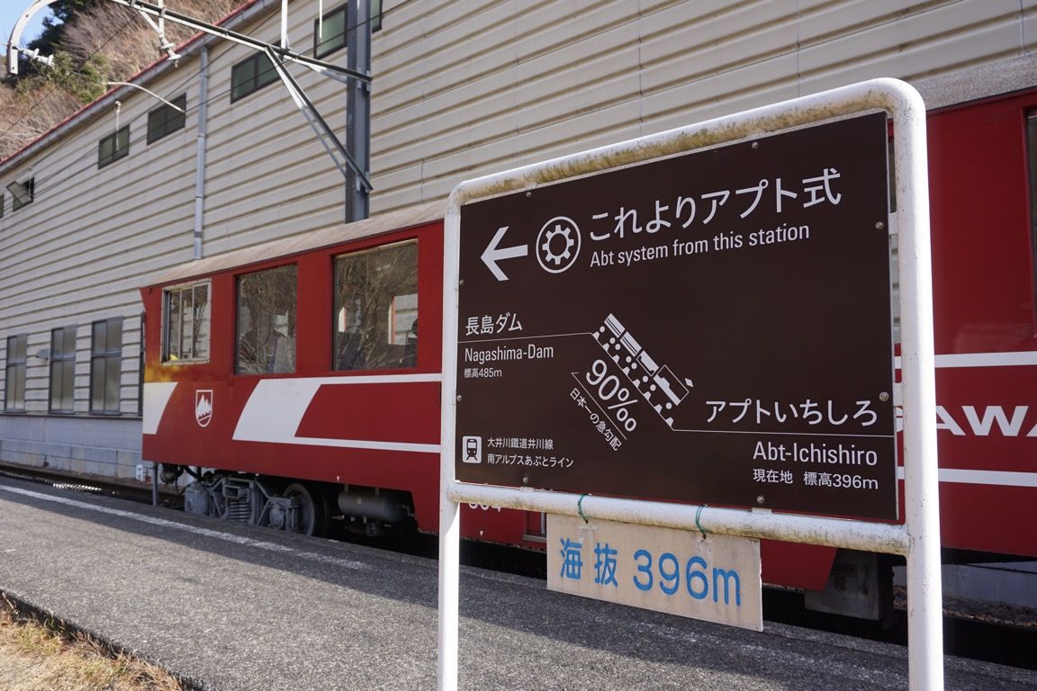 アプトいちしろと次の長島ダム駅の間がこの路線の最大のみどころである。ここから路線はアプト式という方式の鉄道へと変わり、日本の普通鉄道の路線の中で最も急な坂道を登って行く。
