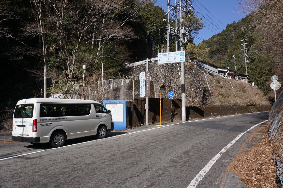 この時間に偶然のように現れたように見えるバスだが、井川線列車とも接続が図られている。井川線の列車乗り継いで、井川地区の中心部へ向かう人のラストワンマイルを担う役割も果たしている。バスはここで数分停車した後、井川地区の中心部へ向けて発車していった。