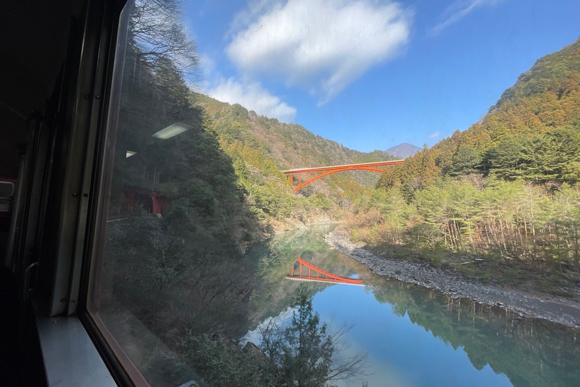 列車交換が可能で、駅員も配置されている奥泉を出ると、再び大井川が車窓に現れ、その上に架かる真っ赤な橋が目に入る。井川線に並走する県道388号線の泉大橋である。もともとはこの先の長島ダム建設工事用に架けられた橋で、後に県道へ転用されたものだという。風のない午前中には、水面に赤いアーチが映り込み、見事な水鏡をつくり出す。その光景はどこか幻想的だった。その後、やがて列車は大井川を渡り、アプトいちしろに到着した。