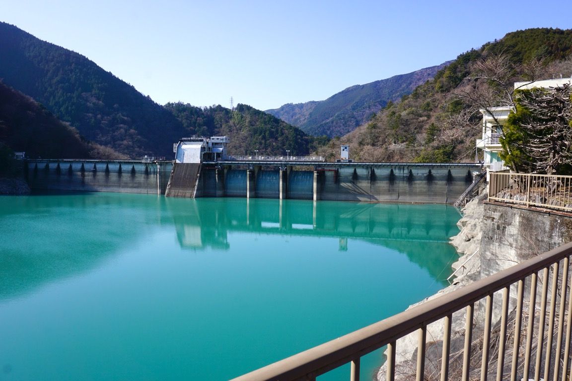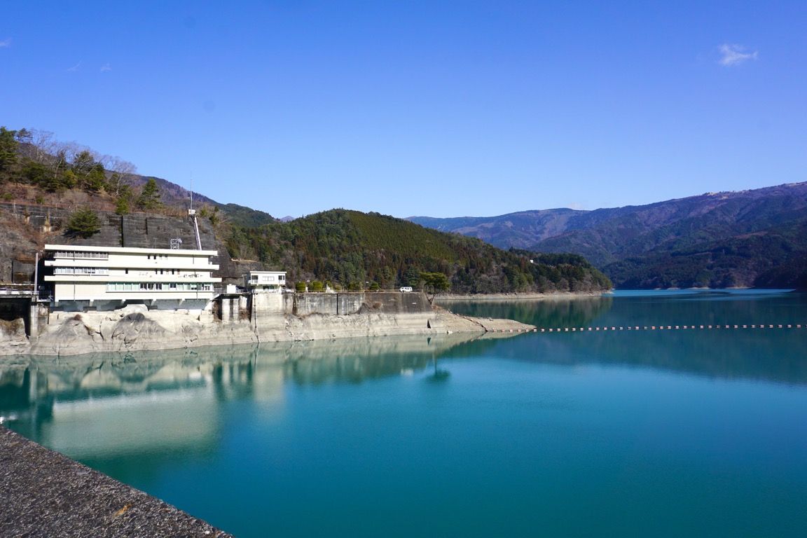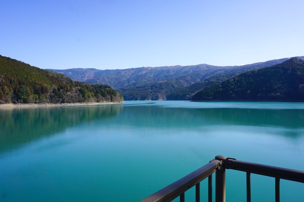 反対側に目を向けると、エメラルドグリーンに輝く井川湖が広がっている。この日は雲ひとつない快晴で、湖面はいっそう鮮やかに見えた。湖はここから約8.5kmにわたり続いている。大井川には複数のダムがあるが、井川湖はその中でも最大規模を誇る。