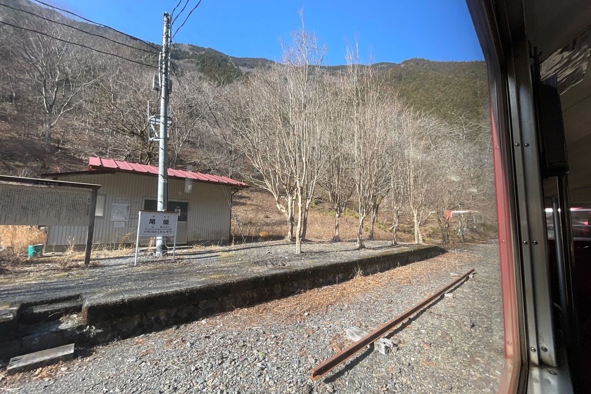 やがて列車は尾盛に到着する。井川線のみならず、全国でも名の知れた秘境駅である。周囲に民家はなく、駅から直接外へ通じる道もない。かつてこの地にはダム建設に伴う作業員宿舎があり、その名残として駅が設けられたという。現在も営業を続けており、下車は可能だが、列車本数が極端に少ないため、運転見合わせなどが起きれば身動きが取れなくなる恐れもある。訪れるには万全の条件を選ぶ必要がある駅となっている。