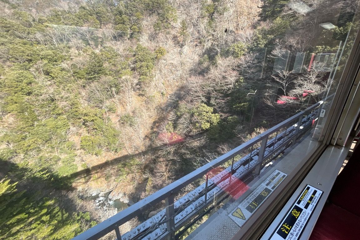 尾盛を出ると、まもなく関の沢橋梁を渡る。大井川の支流・関の沢川に架かるこの橋は、高さ70.8メートルを誇り、国内で最も高い鉄道橋として知られている。谷底ははるか下方にあり、その高さに圧倒される。以前は宮崎県の高千穂鉄道の高千穂橋梁が一位だったが、この路線が廃止されたため、この鉄橋が一位となった。