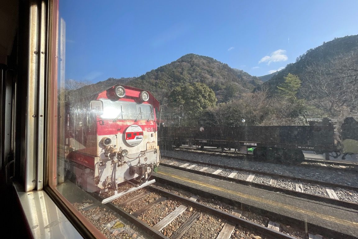 当然ながら、あえて非暖房車を選ぶ乗客はおらず、最後尾の車両は筆者一人の貸切状態となった。小ぶりな車両ゆえ、より一層プライベートな空間に感じられる。扉は手動式で、車掌が一つ一つ閉めて回ったのち、列車は発車した。およそ10名の乗客を乗せたこの日の下り一番列車は、井川へ向けてゆっくりと走り始めた。