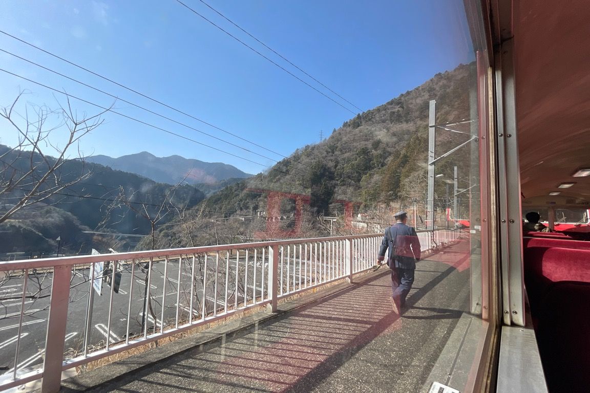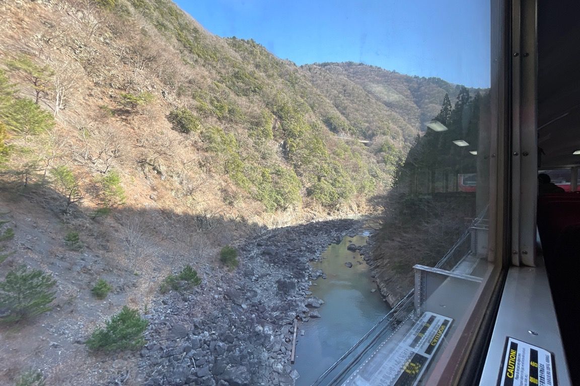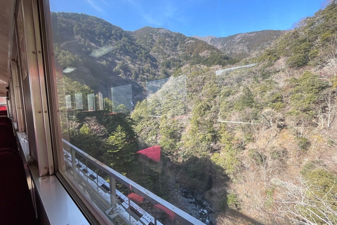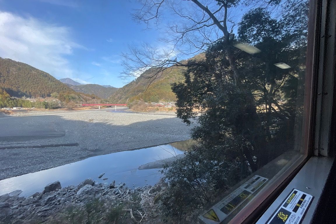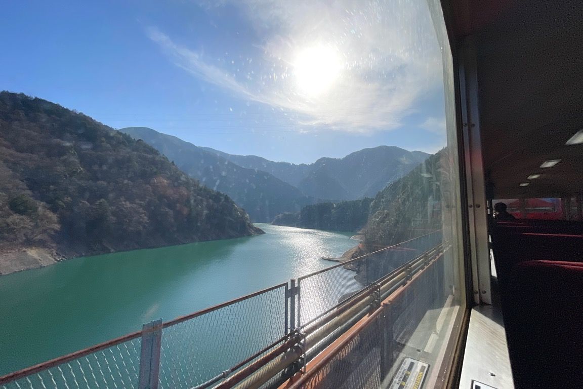 往路では少し寒さを感じた暖房のない車内も、井川停車中に差し込んだ日差しのおかげでいくぶん暖まっている。再び車内にはキーキーという軋み音が響き、警笛が山間にこだまする。列車は幾つものトンネルをくぐり抜けながら走っていく。