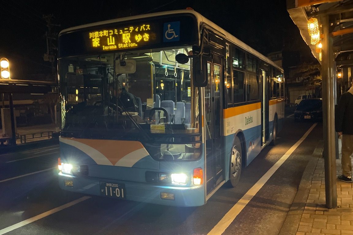 さて、バスを待っているうちにすっかり日も暮れ、時刻は17時30分を回った。駅前のバス停にも、ぽつりぽつりと乗客が姿を見せ始める。筆者を除けば、直前に到着した井川線の列車からの乗り換え客のようだった。