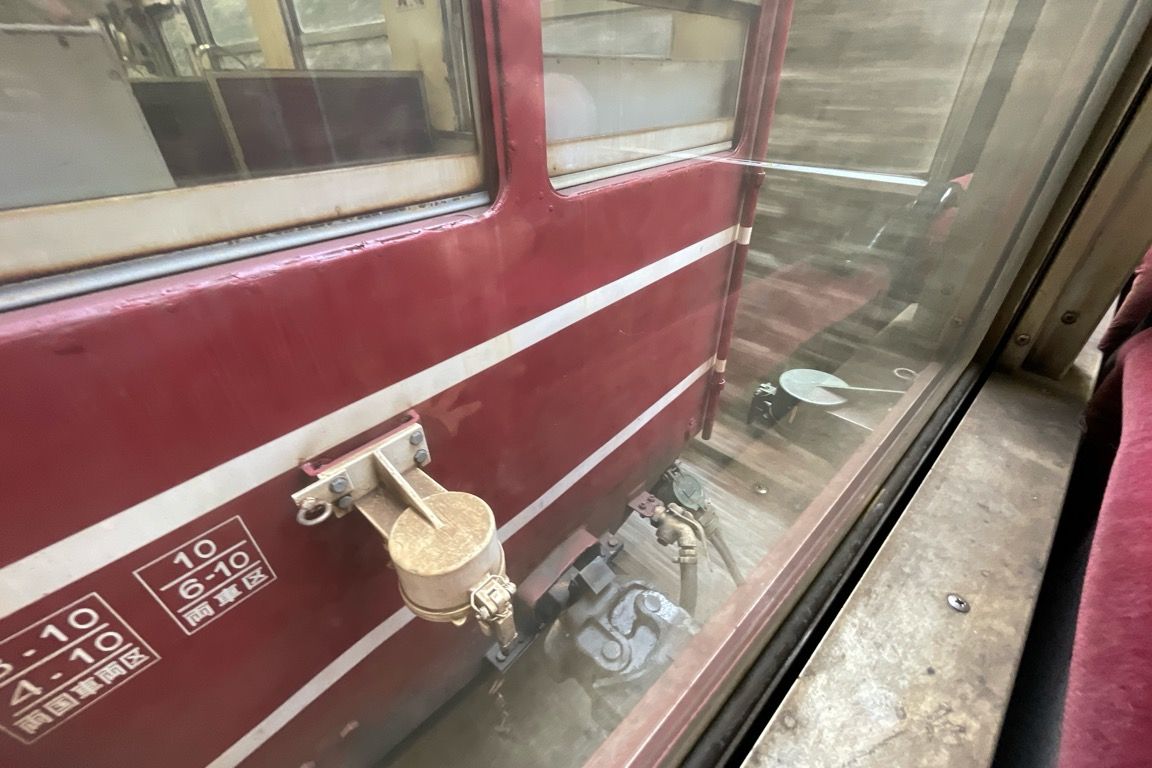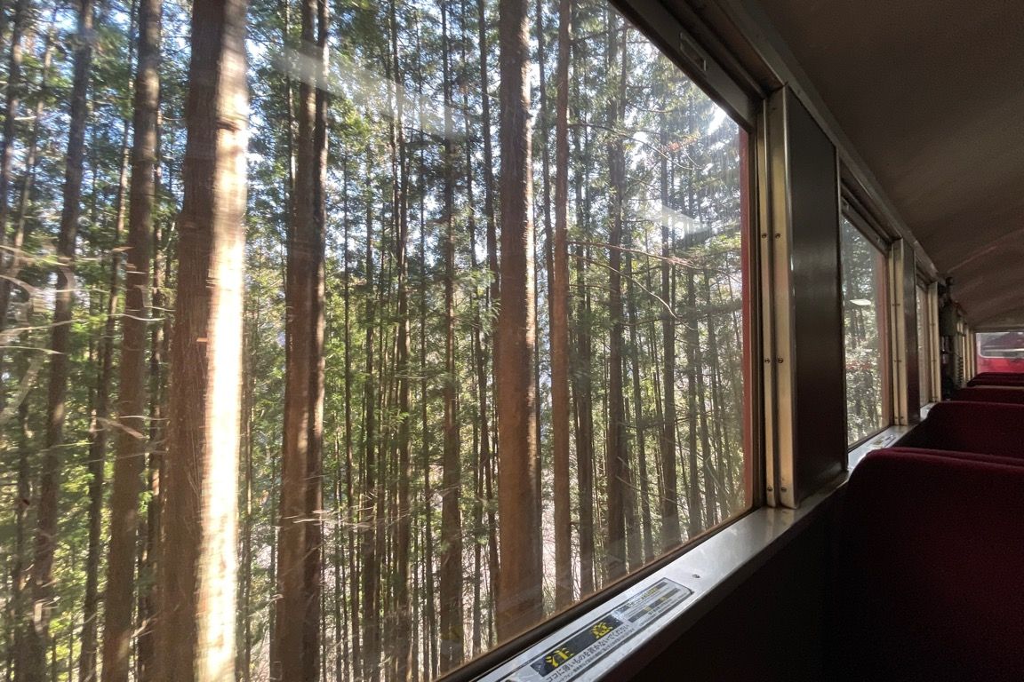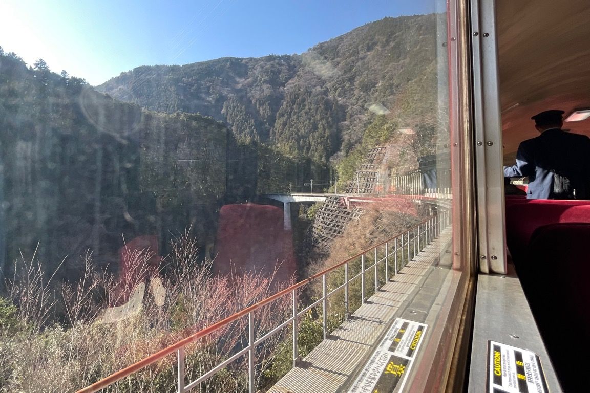 今度はあえて車両の最後尾に座ってみた。振り返ると連結部がよく見える。客車は前を走る機関車に牽かれ、引っ張られるようにして進んでいく。この感覚を言葉にするのは難しいが、実に心地よい。とりわけカーブに差しかかる瞬間が楽しい。山間をくねくねと進むトロッコ列車ならではの醍醐味である。