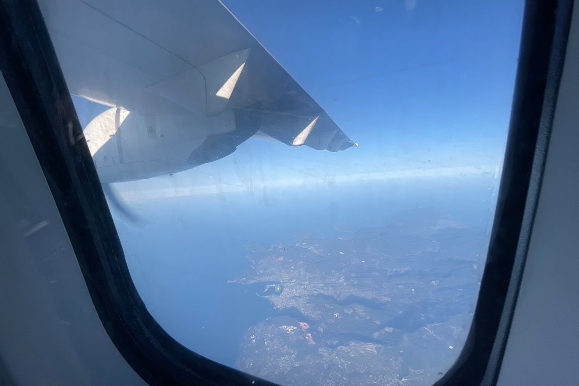 着陸した飛行機は滑走路の途中で反転し、駐機場へと向かう。小さなターミナルがこちらの機窓に見えた。駐機場に到着するとマーシャラーの誘導を受け、ターミナル横に駐機する。まもなくベルトサインが消え、1時間10分ほどの朝のフライトは、静かに幕を下ろした。