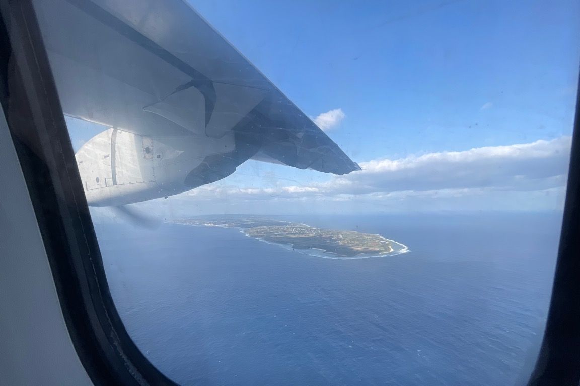 次第に海が近づき、時折白波を上げる様子が見える。まもなく機窓の先には、目的地である沖永良部島が姿を現した。雲が広がる中で、空港周辺だけが晴れている。まるで「目的の島はここだよ」と教えてくれているかのように、太陽がスポットライトを当てる。勾玉のような形をした沖永良部島。空港周辺はやや細い形をしている。その奥には白波が立つ海岸線が続き、島が大きく広がっている。